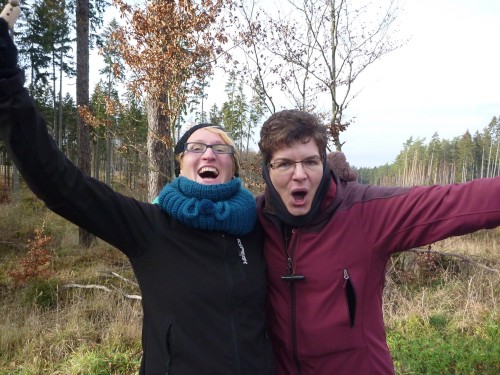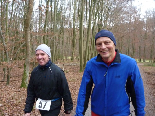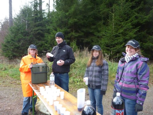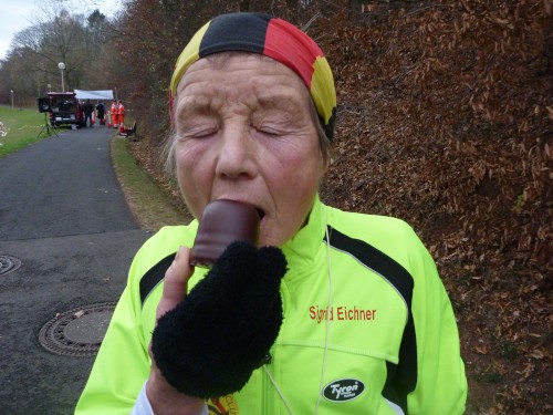 Blitzschneller Zieleinlauf. Jochen und seine Frau haben alles im Griff, Lisa macht die Zeitnahme. Glühwein! Wie Glühwein? Und so kommt es, dass ich mit Sigrid die Glühweinwertung gewinne. Dazu „Schaumküsse“. Mir egal, wie die Dinger nun genannt werden, Sigrid hat nach dem 10ten Negerkuss dieses weisse Zeug noch auf der Oberlippe und niemand sagt was. Es ist wie bei Loriot, nur ohne Nudel.