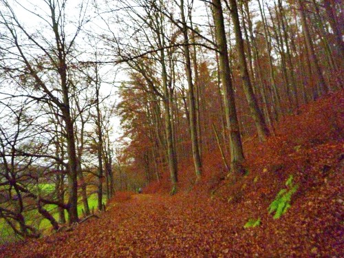 Ulla zieht jetzt vorbei, genießt diesen grandiosen Weg durch das goldbraune Buchenlaub. Das hat wirklich was! Die Füsse schleifen durch zentimetertiefes Laub. Wir sind wieder Kinder. Der Lohn für all die Kilometer!