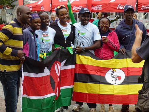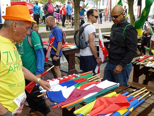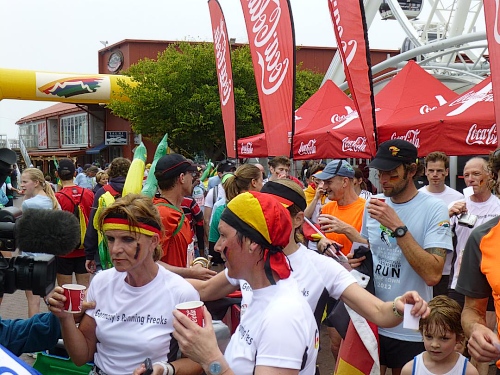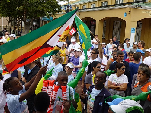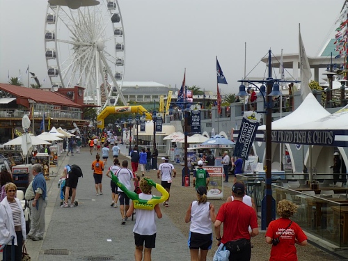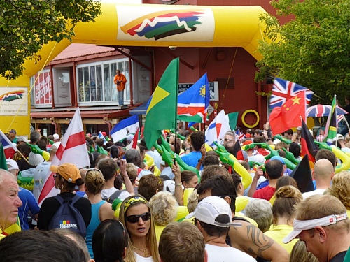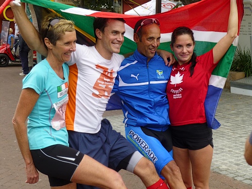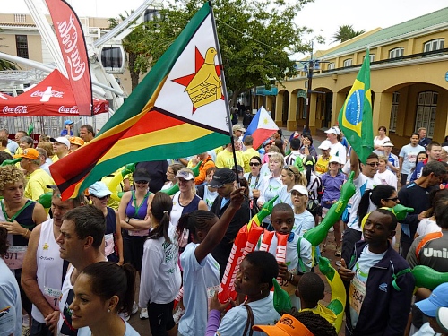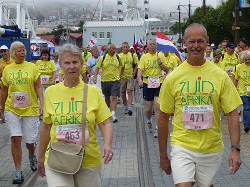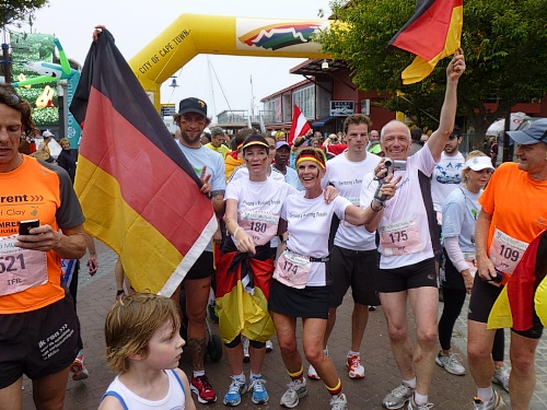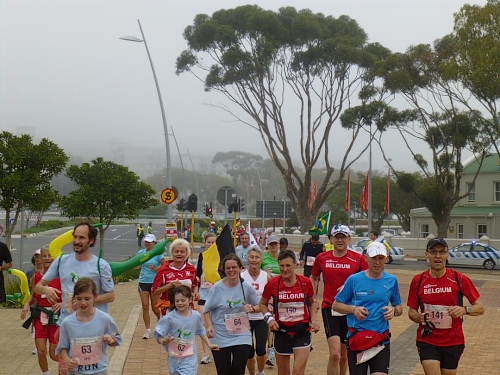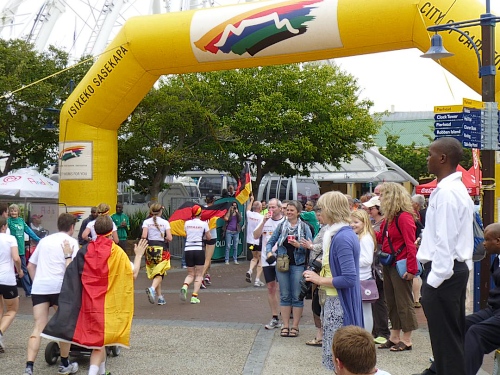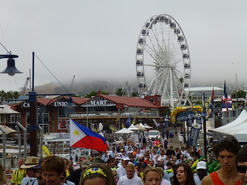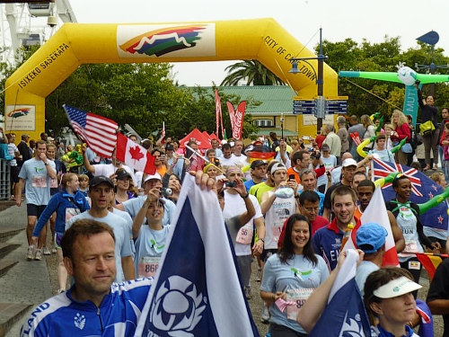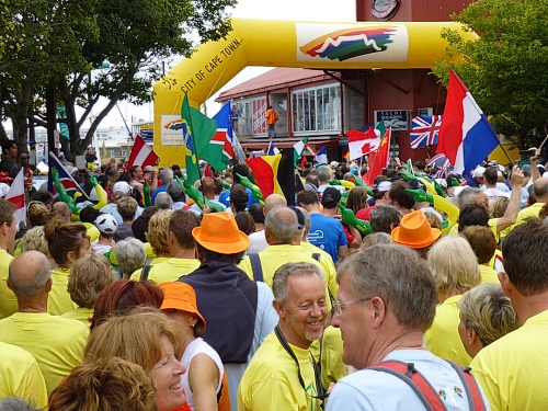 Ein ausgelassenes buntes Bild bietet sich am Freitagmorgen gegen 9 Uhr inmitten der Waterfront zwischen Amphitheater und dem alles überragenden weißen Riesenrad. Ihre Nationalität tragen nicht wenige der knapp 770 gemeldeten Teilnehmer zur Schau, Fahnen aller in diesem Jahr teilnehmenden 78 Nationen liegen zum Schwenken bereit. So recht flattern wollen sie aber nicht im Wind, denn leider hält sich ausgerechnet heute der berühmt-berüchtigte “Southeaster”, quasi der Hauswind Kapstadts, zurück und erlaubt so den dicken Wolken, Kapstadt bis knapp über den Boden einzuhüllen. Dem häufig wehenden “Southeaster” ist zu verdanken, dass die Stadt zumeist smogfrei ist, was ihm auch den Spitznamen “Cape Doctor” eingetragen hat. Er zaubert auch das berühmte Wolken-“Tischtuch” auf dem Tafelberg, während der Rest der Stadt wolkenfrei ist. Doch er kann auch anders. Und an schlechten Tagen fegt er auch schon mal mit orkanstarken Böen durch die Stadt.