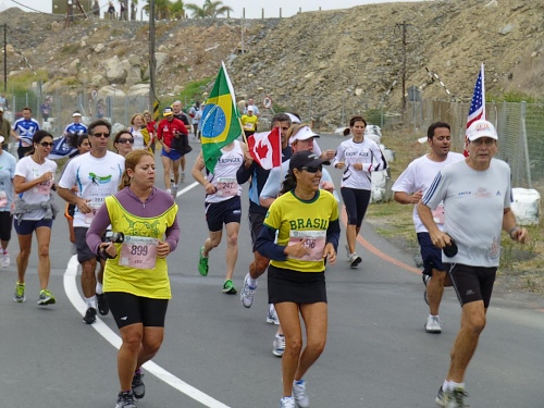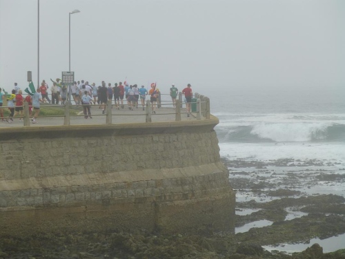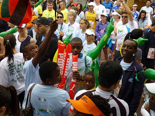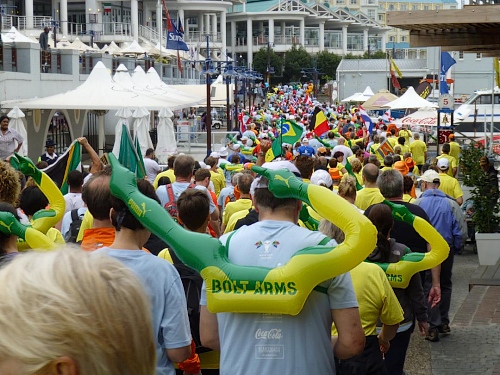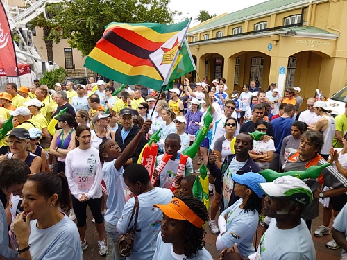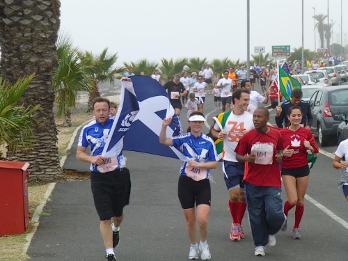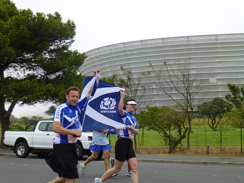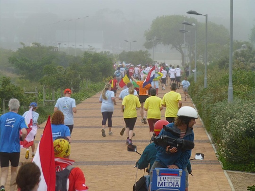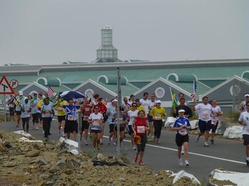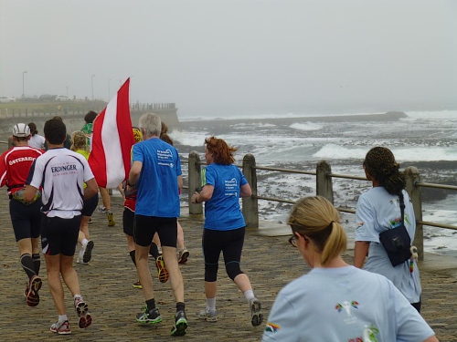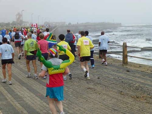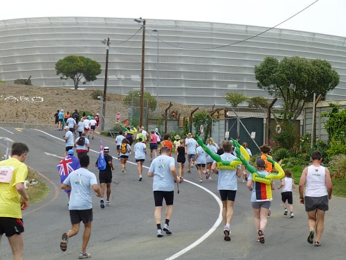 Mit lauter Popmusik werden die Läufer in Stimmung gebracht. Alle Teilnehmerländer werden einzeln willkommen geheißen. Mit Gejohle melden sich vor allem die mit größeren Kontingenten vertretenen Nationen. Kurz nach 9:30 Uhr ist es so weit: Fahnenschwenkend zieht der Läufertross im Schneckentempo los. Zunächst am Victoria Bassin mit dem gleichnamigen Shopping-Centre entlang führt uns der Kurs schon bald auf die Beach Road direkt am Meer entlang. Zu unserer Linken türmt sich das mächtige Oval des anlässlich der Fußball-WM mit einer Kapazität von 68.000 Zuschauern errichteten Cape Town Stadium. Mit seiner markanten weißen Gitterfassade ragt es wie ein gewaltiges UFO aus der Umgebung.