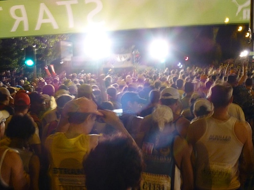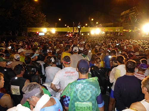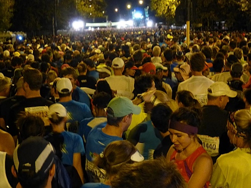Musik von David Guetta und Coldplay donnert durch die Nacht, durchbrochen durch allerlei Ansagen. Ganz unterschiedlich bewältigen die Läufer die Vorstartphase: Da sind die, die lachend und tanzend herum springen und auch die, die es sich ruhesuchend auf dem Asphalt bequem machen, aber auch die, die nervös die Warteschlagen vor den Klohäuschenbatterien bevölkern. Nun ja, wie immer bin ich bei Letzeren dabei. Zum Glück ist es nicht kalt; 15 Grad C mögen es sein, sodass die Entscheidung für ein knappes Laufoutfit nicht schwer gefallen ist.