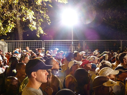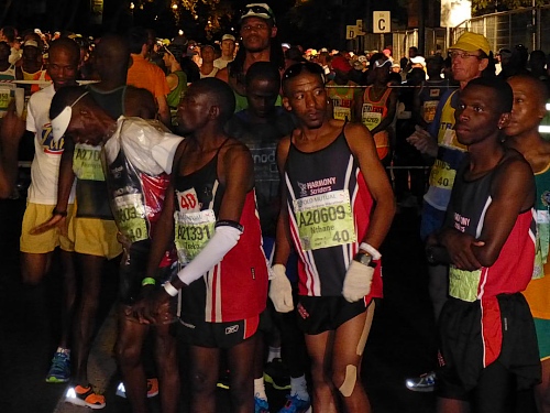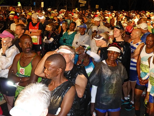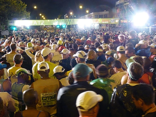 Über die Autobahn M3 gelange ich schnell hinaus in den einige Kilometer südlich des Zentrums gelegenen Stadtteil Newlands. Eine Shuttlebusverbindung zum Start gibt es aus dem Zentrum leider nicht, daher bleibt neben der Möglichkeit der Nutzung eines Taxis nur die eigene Anfahrt. Doch letztere ist letztlich kein Problem, zumal der mit den Startunterlagen ausgegebene Anfahrtsplan gut bei der Orientierung hilft. Und überhaupt: Der zunehmend dichte Verkehr und der Autostau an der Ausfahrt Richtung Startgelände zeigt mir auch so, dass ich auf dem rechten Weg bin. Vier große Parkzonen sind in Gehweite des Startpunkts eingerichtet, unter anderem auf dem weitläufigen Gelände der Sacs Schule. Von hier muss ich nur der Karawane folgen und schon finde ich mich auf dem hell erleuchteten Startareal auf der Main Road von Newlands, unweit des Universitätscampus von Kapstadt gelegen, wieder.