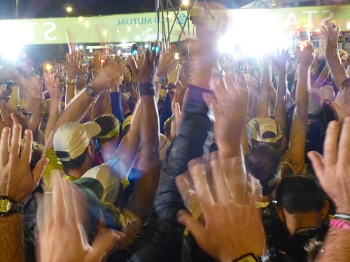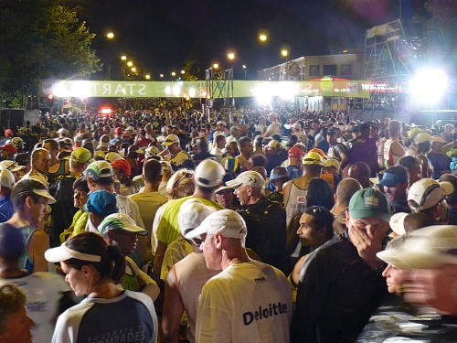 Die letzten Sekunden werden herunter gezählt. Dann ertönt pünktlich um 6:25 Uhr der Kanonenschuss, der das Rennen eröffnet. Der Startschuss setzt der Anspannung ein jähes Ende. Ein Aufschrei geht durch die Menge. Ansonsten passiert noch nicht viel und wir trippeln langsam der Startlinie entgegen. Und dann endlich, unter dem grünen Startbanner hindurch, ist wie von Geisterhand auf einmal der Weg frei. Wir laufen hinaus in die Nacht durch die nicht endend wollenden Lichter der Vorstadt. Immer geradeaus geht es auf der Main Road gen Süden, Kilometer um Kilometer. Schnell wird es ruhiger und es schallt nur noch das Trappeln Tausender Schuhe durch die Dunkelheit.