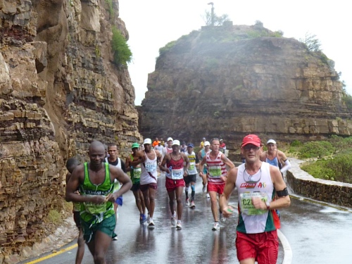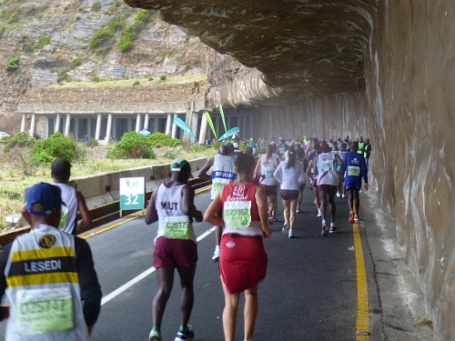 Dass die Extremlage der Straße durchaus Gefährdungspotenzial für Leib und Leben besitzt, belegen zahlreiche Sicherungsmaßnahmen, etwa den Fels überspannende Stahlnetze sowie großflächig mit Beton überspritzte Felswände. An einer Stelle ist die Straße so tief in den Fels hinein getrieben, dass er sie zur Hälfte überdeckt, in der Folge wird sie zudem durch eine Galerie geschützt. Diese Eingriffe mögen zwar ein wenig die Ästhetik der dramatischen Felsenwelt stören, aber aufgrund des latenten Steinschlagrisikos sind sie sicher das kleinere Übel. Geschaffen wurden die Sicherungen vor allem, nachdem im Jahre 2000 eine Gerölllawine fast ein Drittel Straße verschüttet hatte und damit die Strecke für vier Jahre auch für die Two Oceans Läufer unpassierbar machte. Der Lauf fand dennoch statt, doch nahmen die Läufer in dieser Zeit ab Sun Valley den Ou Kaapse Weg, den Alten Kapweg durch das Innere der Kap Halbinsel, eine gleichfalls schöne Strecke, die allerdings den Two Oceans wörtlich genommen zum One Ocean Marathon degradierte. Welchen Nimbus die “historische” Streckenführung über den Chapman’s Peak Drive bei den Läufern hat, zeigt, dass im Jahr der Wiederöffnung, 2004, der bis heute geltende Rekord von 8.692 Finishern erzielt wurde.