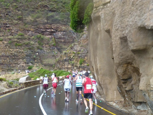 Bei der Verpflegungsstation in Noordhoek gibt es erstmals auch etwas zu beißen: kleine Kartoffeln mit Schale. Keine schlechte Idee, vor allem, weil wir ab jetzt verstärkt Energie benötigen. Denn ab hier, bei km 28, also genau zur Streckenhälfte endet der profilmäßig gemütliche Teil der Strecke, beginnt die eigentliche Herausforderung und kündet sich der Streckenteil an, der vor allem auf die ausländischen Marathon-Touristen eine magische Anziehungskraft ausübt.