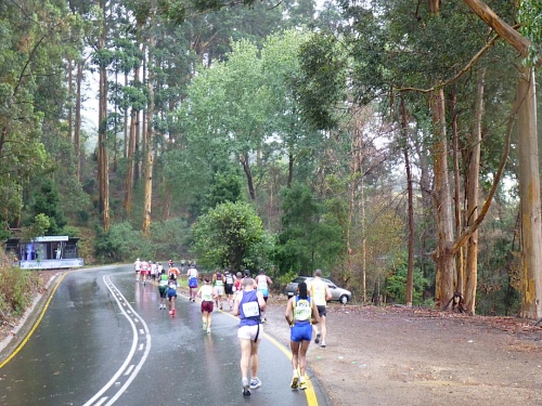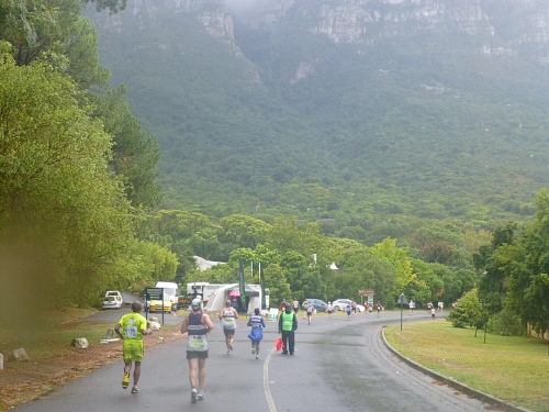 Kurz vor dem Marathonpunkt ist es dann soweit: Die Steigungen nehmen zu, die Kurven auch. Die vier schwersten Kilometer des Rennens liegen vor uns, hinauf zum Constantia Nek, einem Pass auf der Rückseite des Tafelparks und der höchstgelegene Punkt unserer Strecke. Erstmals fällt das Gros der Läufer hier nun in einen schnellen Gehschritt. Die bisherige Anstrengung fordert ihren Tribut. Ausgesprochen ruhig ist es im Läuferfeld. Jeder ist mit sich selbst beschäftigt.