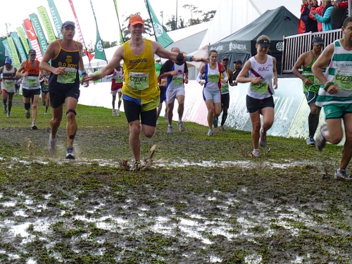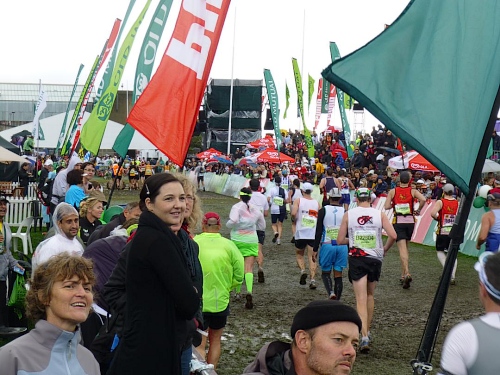 Von der M3 werden wir direkt auf das weite, grüne Rugby-Feld zu Füßen der Universität geleitet. Die Hoffnung auf das nahe Ziel mobilisiert die letzten Kräfte. Eine letzte Runde müssen wir auf dem elastischen und durch den Regen zusätzlich aufgeweichten gepflegten Rasen noch zurück legen. Ein seltsames Gefühl nach 55,5 km hartem Asphalt. Die meisten werden diesen halben Kilometer aber als höchstpersönlichen Triumphzug erleben. Ein erhebendes Gefühl ist es, den banden- und fahnengesäumten Parcours durch die weitläufige Zeltstadt, die auf dem Rugbyfeld errichtet wurde, zurückzulegen, angefeuert aus zahllosen Kehlen derer, die sich entlang der Banden und auf den Tribünen versammelt haben, begleitet von lauter Musik und der Kommentierung des Zieleinlaufsprechers. Eine spezielle Herausforderung halten die letzten 100 Meter bereit. Denn hier haben die Heerscharen der Halbmarathonläufer den feuchten Boden bereits derart malträtiert, dass nur eine Schlammgrube übrig geblieben ist, sehr zur Freude der Zuschauer und zur Überraschung der einlaufenden Ankömmlinge. Ich versuche wie viele noch am Bandenrand ein halbwegs gangbares Wegstück zu finden. Aber da habe ich keine Chance: Meine Laufschuhe, die zwar pitschnass, aber bisher sauber waren, bekommen eine dicke Schlammpackung verpasst. Aber als glücklicher Finisher nimmt man das ohnehin gelassen und freut sich voyeuristisch an den Manövern und Verrenkungen derer, die noch nach einem einlaufen.