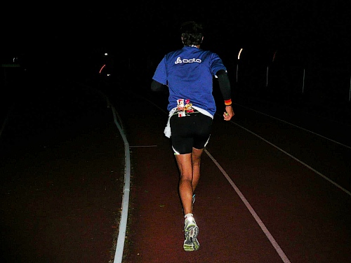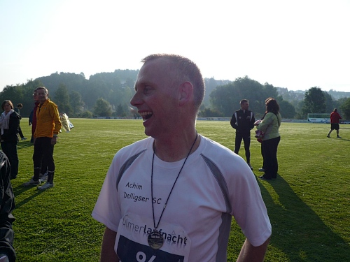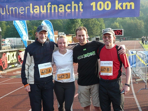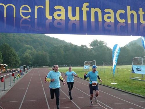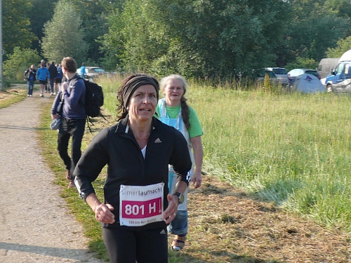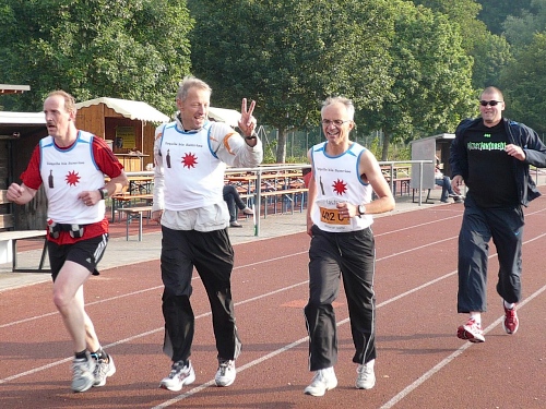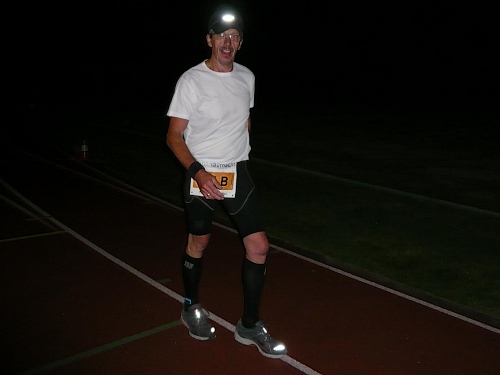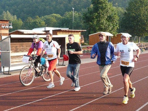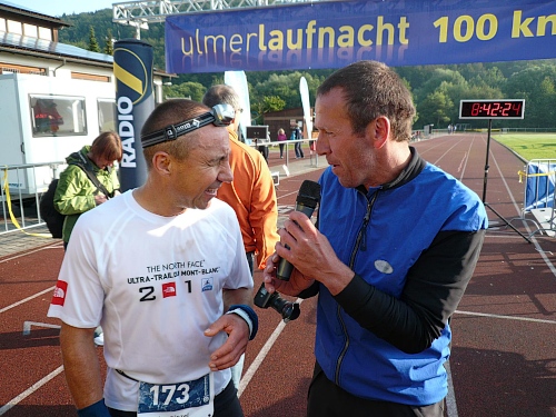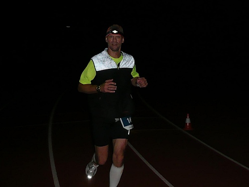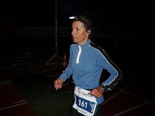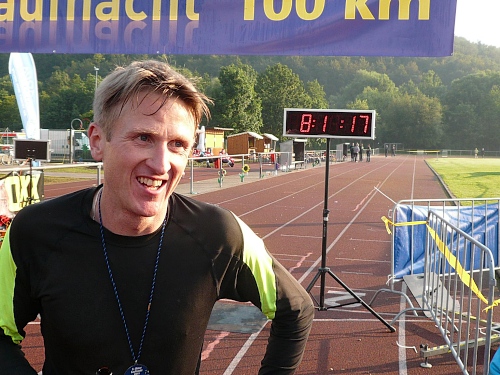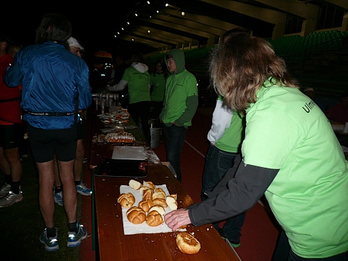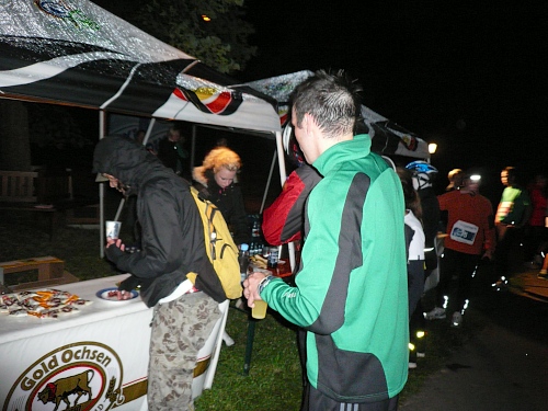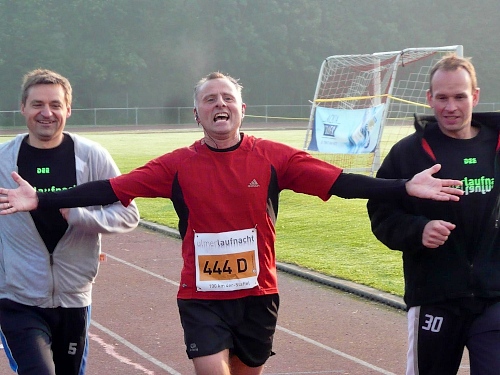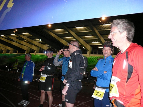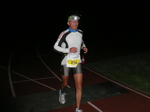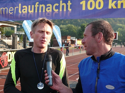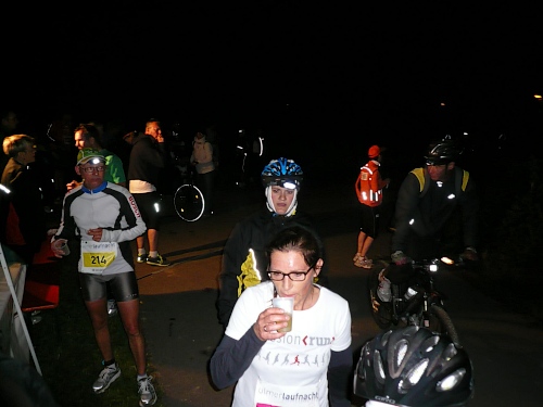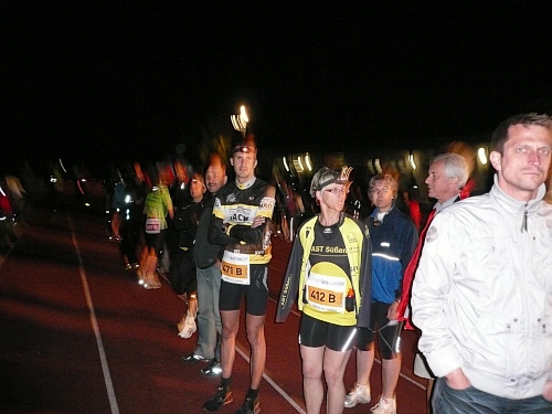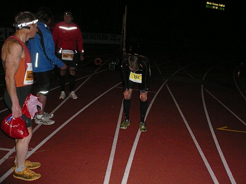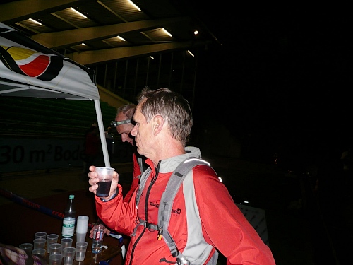 Ich halte mich in der Turnhalle auf und gehe dann später in das Stadion, um die Zieleinläufe zu beobachten. Es ist erstaunlich, wie die Finisher über die 100 Kilometer daherkommen. Im Durchschnitt schauen die besser aus als die Staffelläufer. Der Sieger Jürgen Kiebler nimmt Sekunden nach seinem Zieldurchlauf einen tiefen Zug aus der Bierpulle. Mein Freund Martin Wildmoser schwärmt von dem Nachtlauf: „Da kannst du laufen ohne Zeit und Raum, einfach nur für dich und die Zeit genießen.“ Dass er seine Premiere über diese Distanz erfolgreich abgeschlossen hat und das noch unter 9,5 Stunden, das will ich erwähnen und herausstellen.