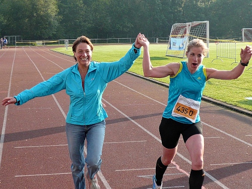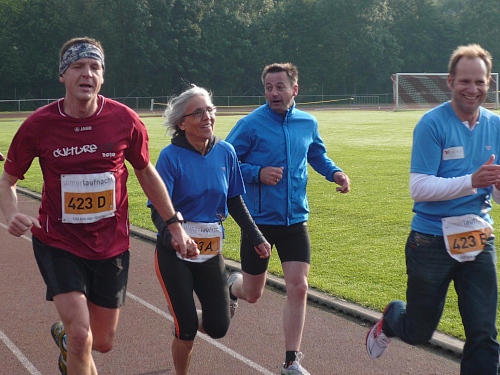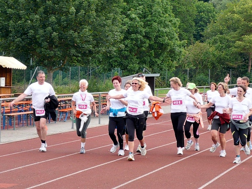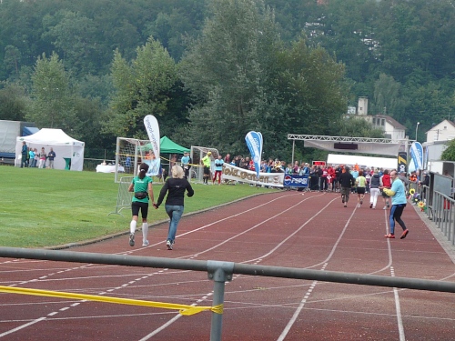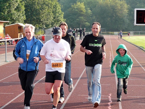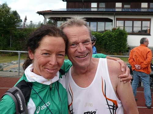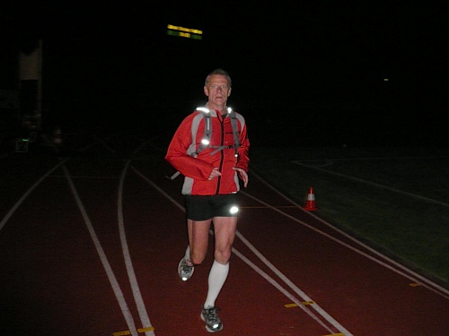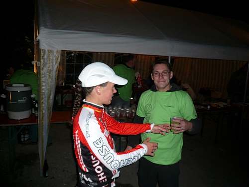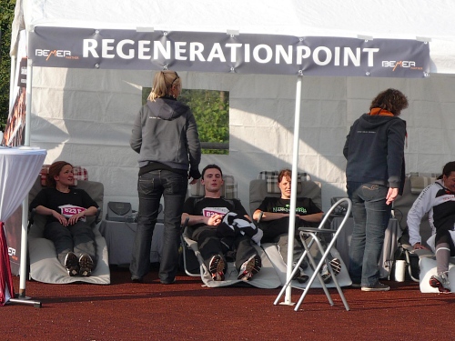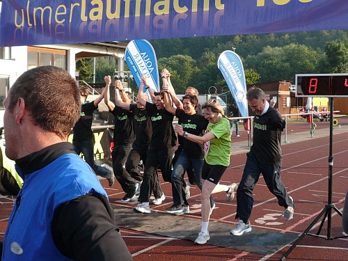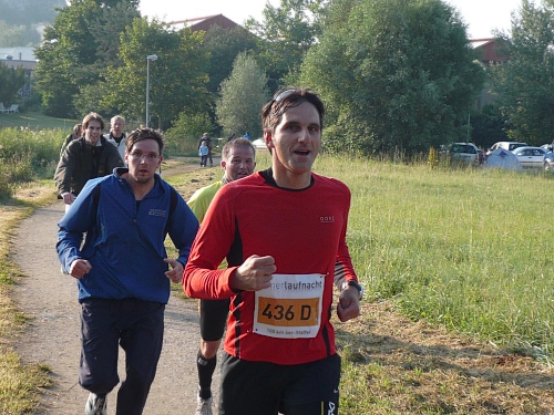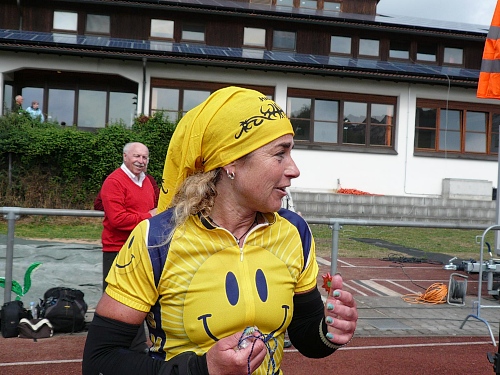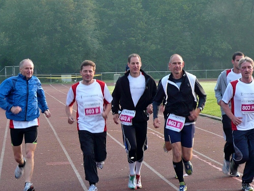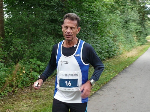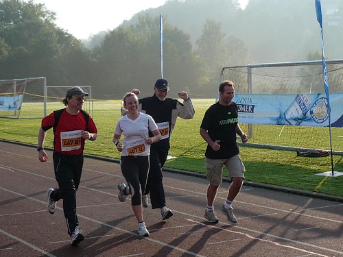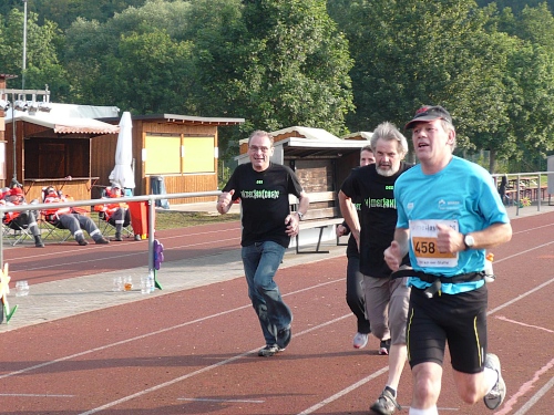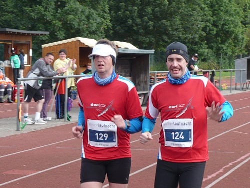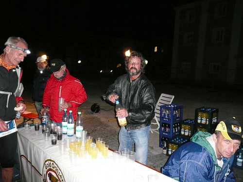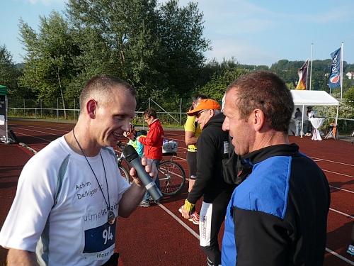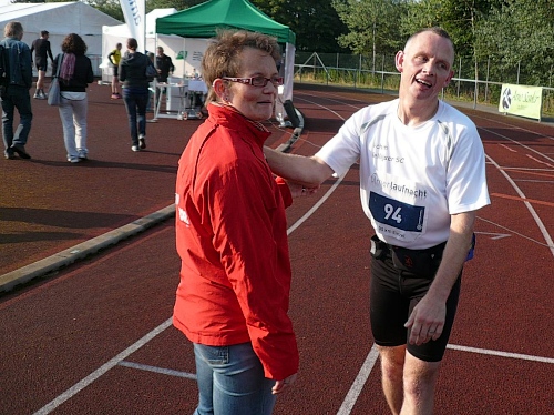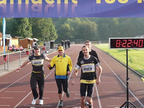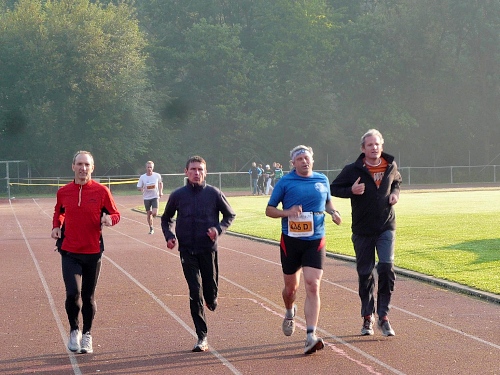 Ich halte mich in der Turnhalle auf und gehe dann später in das Stadion, um die Zieleinläufe zu beobachten. Es ist erstaunlich, wie die Finisher über die 100 Kilometer daherkommen. Im Durchschnitt schauen die besser aus als die Staffelläufer. Der Sieger Jürgen Kiebler nimmt Sekunden nach seinem Zieldurchlauf einen tiefen Zug aus der Bierpulle. Mein Freund Martin Wildmoser schwärmt von dem Nachtlauf: „Da kannst du laufen ohne Zeit und Raum, einfach nur für dich und die Zeit genießen.“ Dass er seine Premiere über diese Distanz erfolgreich abgeschlossen hat und das noch unter 9,5 Stunden, das will ich erwähnen und herausstellen.