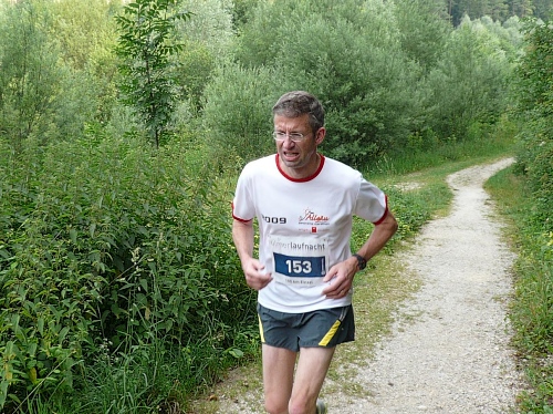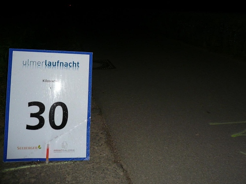Ich verlasse die Klosteranlage und habe einen Läufer im Genick, der ebenfalls auf der Kurzstrecke unterwegs ist. Der darf nicht an mir vorbei, so mein Gedanke. Und dann versuche ich das Tempo hoch zu halten. Die Schleife wieder an die Iller heran habe ich in schlechter Erinnerung. Denn 2009 war es da äußerst dunkel und meine Lampe funzelte mehr schlecht als recht. Heute sind zusätzliche Markierungen angebracht.