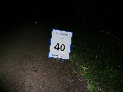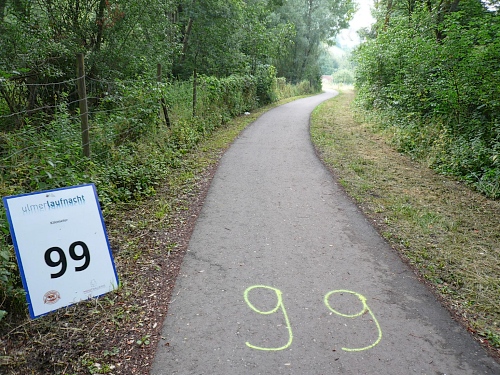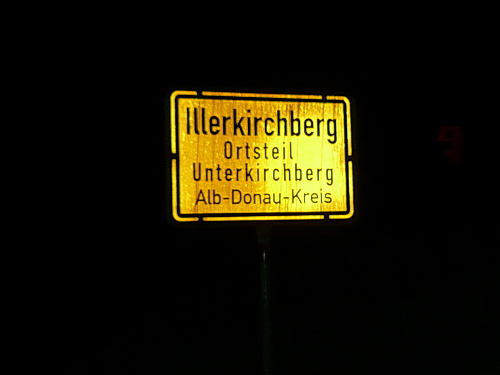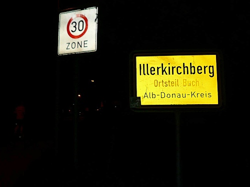 Wir tangieren kurz Unterkirchberg und laufen auf kurzem Wege an die Iller, die jetzt rechts von uns Richtung Norden fließt. Der Schotterweg lässt sich gut belaufen. Das Kilometerschild 40 taucht unvermutet früh auf. Es ist 2.52 Uhr, alles im Plan.