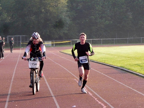 Auf den letzten zwei Kilometern kann ich dann noch auf zwei, drei Konkurrenten auflaufen. Und dann verlassen wir den asphaltierten Uferweg und laufen dann in das Donaustadion. 3.48 Uhr sehe ich auf der Anzeigetafel, als ich kurz danach die Zeitmessmatte überquere.