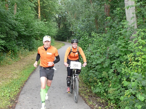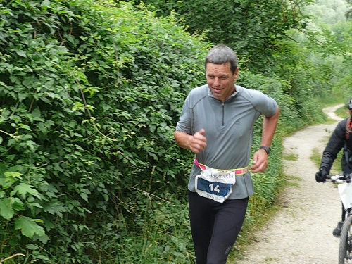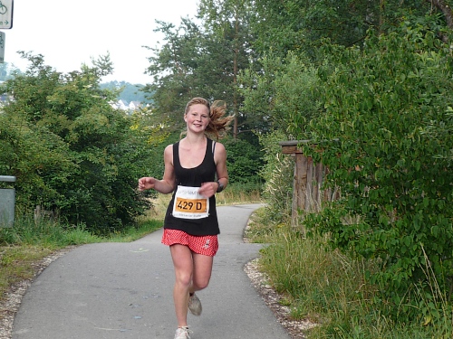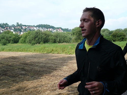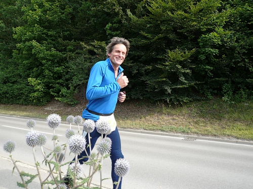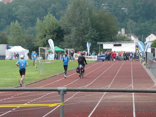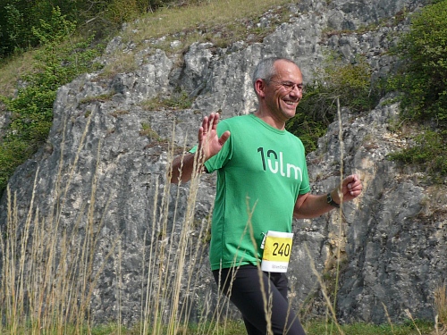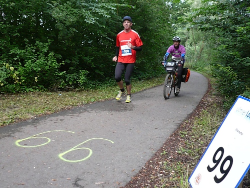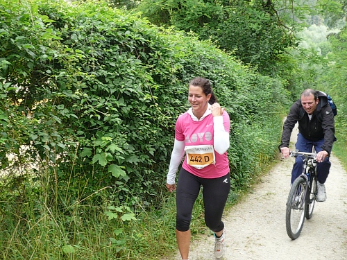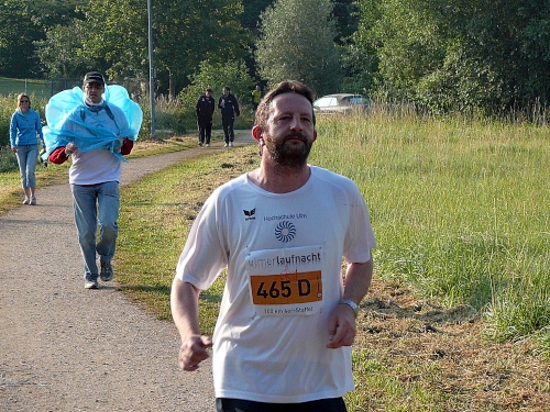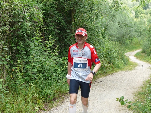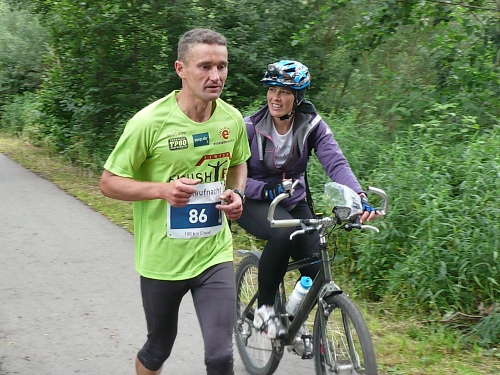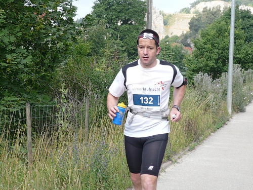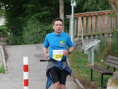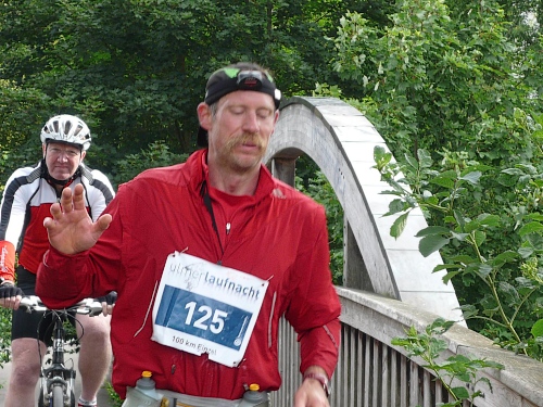 Bei Buch und in Oberkirchberg wartet die letzte Steigung für mich. Etwa 40 Höhenmeter, bei denen ein Radbegleiter entweder einen kleinen Gang einlegen muss oder er steigt gleich ab, weil sein Läufer längst in den Gehschritt gewechselt hat. Für die Hunderter ist es hier wichtig, nicht unnütze Körner liegen zu lassen. Also lieber jetzt einmal öfter wandern als vielleicht bei Kilometer 80 gar nicht mehr laufen zu können.