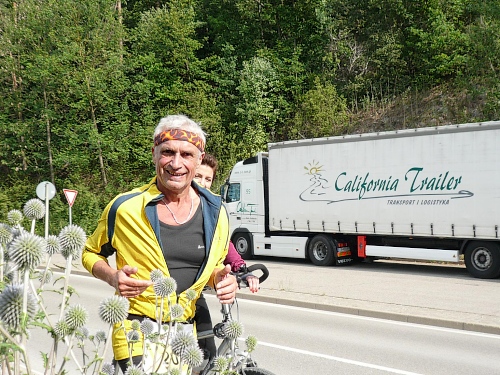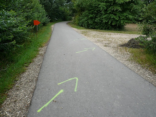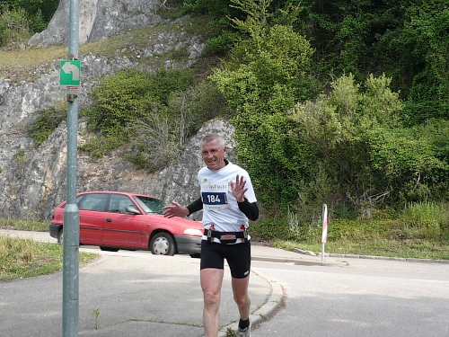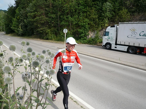 An der folgenden V-Stelle liegt ein „gschmackiger Kaas“ aus der Eidgenossenschaft auf dem Tisch. Ein kleines Fähnchen weist auf die Herkunft hin. „Zur Not frisst der Bayer den Kaas auch ohne Brot!“ Das ist mein Motto, Beim Käse kommt der Geschmack gern vom überhöhten Fettgehalt. Aber jetzt braucht man sich ja nicht mehr zieren, denn die Fettverbrennung wird in Kürze einsetzen. Wenn nicht der eine oder andere schon an der Marathonmauer hängengeblieben ist. 35 Kilometer sind hinter mir, 15 flache warten noch.