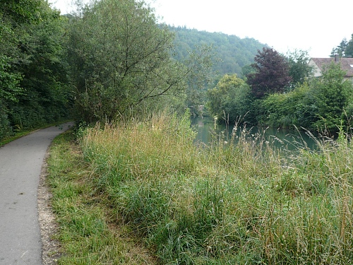 Es geht nun an der Stadtmauerpromenade entlang. Den Kurs kenne ich noch vom Ulmer Marathon. Hier irgendwo war damals die Trennung der Halbmarathonis und der Marathonis. Wenn man hier links abbiegen würde, wäre man in Kürze in der Altstadt. Die Donau scheint jetzt viel Wasser zu haben, denn braun wälzt sich das Nass Richtung Osten. Ich glaube, da fehlt nicht mal ein Meter und wir würden uns auf dem Radweg nasse Füße holen. Linkerhand sehe ich die alte Stadtmauer, die früher inmitten des Stromes stand.