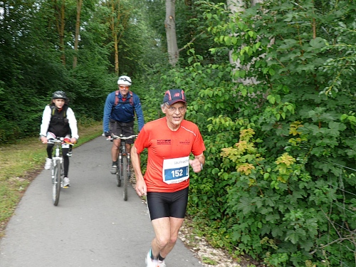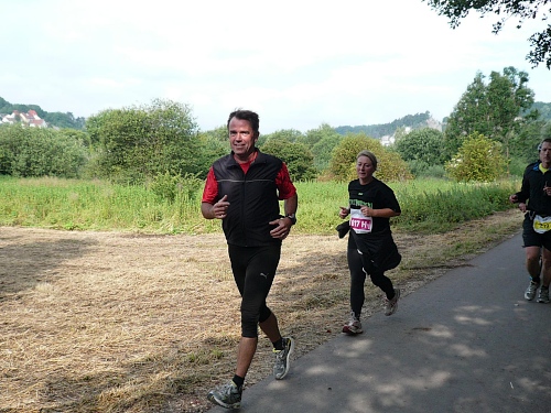 Dann habe ich eine kurzzeitige Krise. Bier und Käse entwickeln sich in meinem Ranzen zu einer explosiven Mischung. Nach dem Boxenstopp ist mir bedeutend wohler. Nur, dass eine Handvoll Läufer jetzt an mir vorbei sind. Wie viele sind davon 50-Kilometer-Läufer, das will ich wissen.