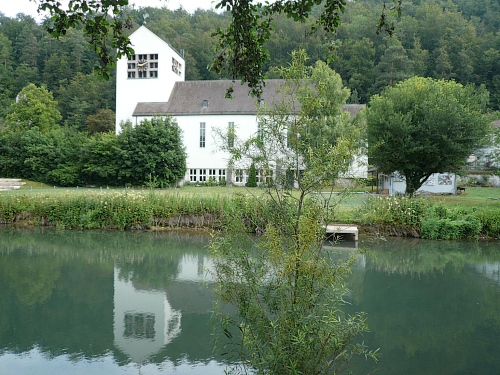 Kurz danach verlassen wir den Uferweg nach links. Eine schmale Brücke muss überquert werden. Da ist es schon gut, dass die Lampe dabei ist. Gerade nach ein paar Metern laufen wir dann an die Klostermauer heran. Im Innenhof des Klosters Wiblingen ist eine weitere V-Stelle eingerichtet. Ich bitte artig: „Wer teilt an diesem heiligen Ort sein Bier mit mir?“ Ein Helfer erbarmt sich und lässt mich an seinem Hopfengetränk laben.