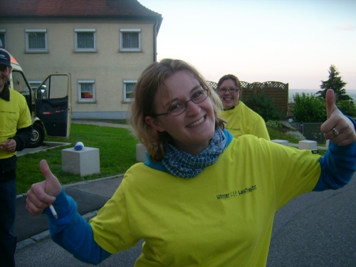 Bei meinem Nachdenken schimpft eine Wildente, die neben unserer Laufstrecke sitzt. Wahrscheinlich ist ihr zu viel los hier. Nach etwa zwei Kilometer wechseln wir auf das Südufer der Donau. Radwegweiser zeigen nach Neu-Ulm, Offenhausen, Pfuhl und Burlafingen. Das Läuferfeld hat sich nun weit auseinandergezogen. Nur hin und wieder kommt ein Staffelmensch von hinten heran. „Morning has broken“, das Lied von Cat Stevens, summe ich vor mir hin.