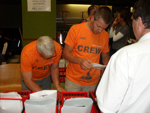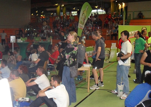 Da jedoch das Länderspiel Deutschland gegen Griechenland stattfand, das in der Halle auf einer Leinwand übertragen wurde, hatte der Veranstalter kurzerhand das Briefing in die Halbzeitpause verlegt. Ulrike Maisch, die Europameisterin im Marathon von 2006 begrüßte die Teilnehmer und machte auch nachher den Start.