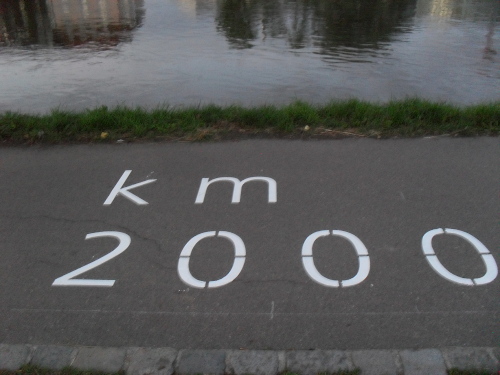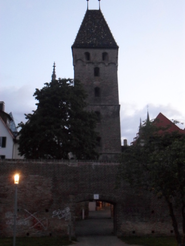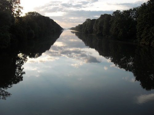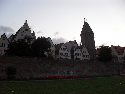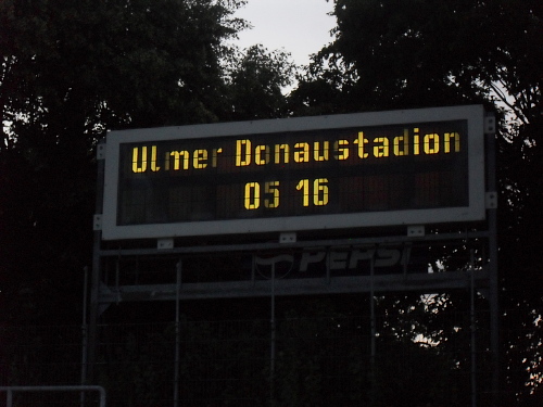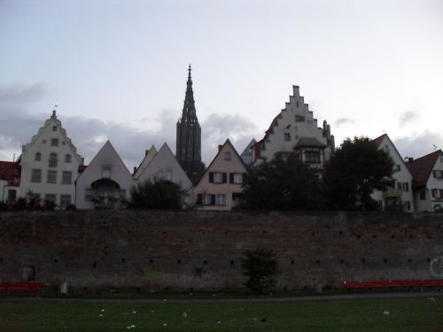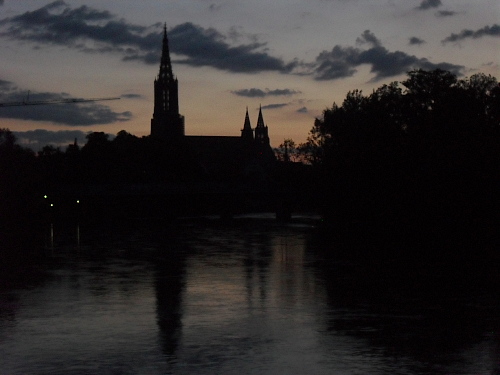 Ich verlasse die Klosteranlage und es geht durch einen Wald wieder an die Iller heran und an diesem entlang bis zur Donaumündung. Im Wald kann es hier recht dunkel sein, so dass auch ausgesprochene Nachtläufer auf eine Lampe angewiesen sind. Stromabwärts tauchen bald die ersten Häuser vom bayrischen Neu-Ulm auf. Rechts, beim Überqueren der Donau über den Fußgängersteg bei der Adenauer Brücke, öffnet sich ein Postkartenblick auf das Ulmer Donauufer mit der Altstadt und dem Ulmer Münster mit dem höchsten Kirchturm der Welt. Schade, dass um diese Uhrzeit das Münster nicht mehr beleuchtet ist und (fast) alles im Dunkeln liegt. Dennoch gibt es hier ein ganz tolles Photo des Doms im Morgengrauen. Ostwärts, nun wieder auf baden-württembergischer Donauseite, und direkt am Donauufer wird die Ulmer Altstadt auf weiterhin flachem Terrain gestreift. Zur linken Seite ist über einen längeren Abschnitt die alte Stadtmauer zu sehen, die ursprünglich einmal inmitten der reißenden Donau gebaut wurde. Nach 50 km halbiert sich die große Schleife auf der Tartanbahn des Ulmer Donaustadions.