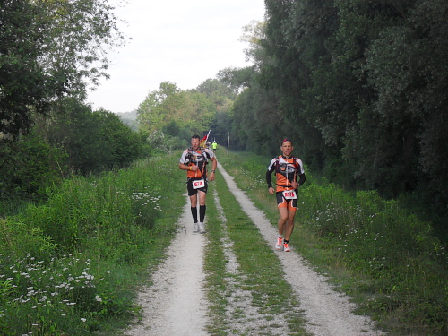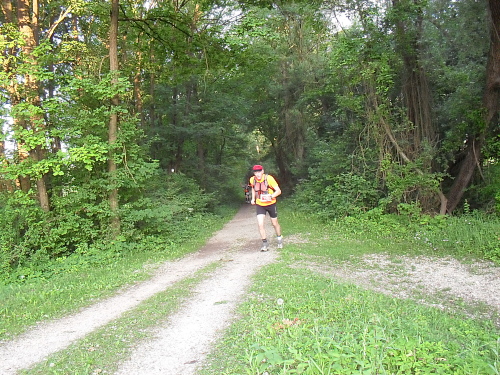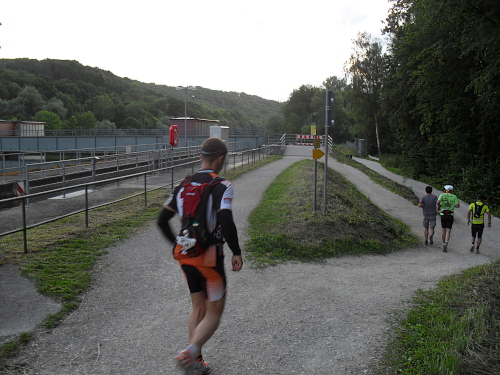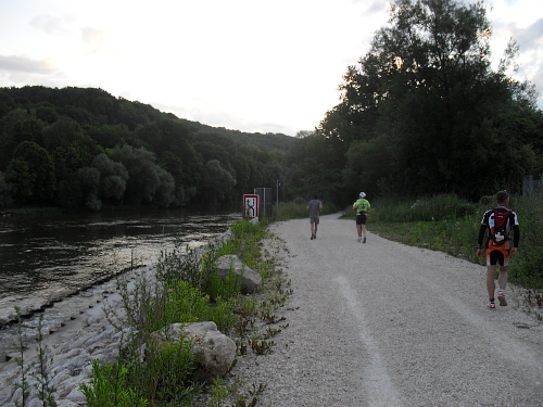 Nun folgt mit 30 km der schnellste und steigungsärmste Abschnitt. Ideal also für Flachlandläufer wie mich. Wir laufen durch das Industriegebiet von Erbach. Der weitere Kurs führt uns dann links der Donau flach nach Donaustetten, wo wir nach dem Überqueren der Donau wieder eine Getränkestelle mit Wasser und Iso finden. Es werden auch Salzstangen, Kekse und Gummibärchen ausgegeben.