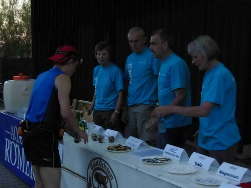 Der ansteigende Gras- und Schotterweg und der Feldweg vorbei am Weiler Kesselbronn war wie immer schlecht zu laufen. Nach dem Wald vor Jungingen folgte die diesjährige Nachtrunde lange der Autobahn A8 in westlicher Richtung. Die Begegnung mit meinen Lauffreunden Helmut und Walter, die hier gerade die Strecke auf dem Rad inspizierten, kündigte früh meinen Heimat-Verpflegungspunkt an, der dann mitten in Jungingen unmittelbar bei der km-Markierung 75 bei einer Lagerhalle aufgebaut war. Von meiner Frau und vielen Laufkolleginnen und Kollegen aus dem Ort werde ich begeisternd empfangen. Den liebevollen VP haben alles Freunde von mir organisiert und betreut.