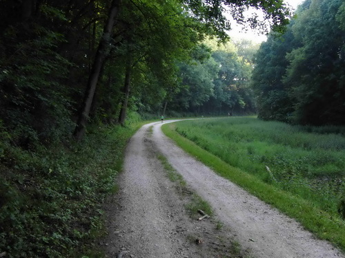 Das Lerchenfeld musste westwärts auf einem breiten Schotterweg, einer Panzer-Übungsstraße, durchquert werden, an deren Ende es mal wieder steil bergab ging. Es kam wie es kommen musste. Diesmal mit dem Anstieg zum VP Mähringen, zunächst noch durch das schöne Tobeltal. Uli drückte auf das Tempo oder besser das, was ich nach 90 km als Höllentempo empfand. Er tat mir in gewisser Weise leid, musste er doch nun schon seit Stunden einen immer müder werdenden Läufer begleiten. Dabei immer gute Stimmung verbreiten und dazu auch noch motivieren. Er hat das einfach fabelhaft gemacht. Dafür schon einmal meinen herzlichen Dank, lieber Uli. Wir hatten wohl dennoch unseren Spaß dabei. Für das kommenden Jahr hat er angeboten, innerhalb meiner Laufzeit die Runde zweimal mit dem Rad abzufahren. Uli, die Wette gilt.