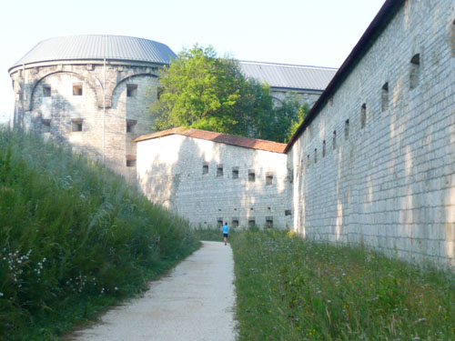 Die 2010er Runde folgte in etwas Abstand der Außenmauer der Wilhelmsburg, so dass der letztjährige Abstieg zur talseitigen Festungsanlage mit dem schönen Mauerdurchlass entfiel. Ein paar Stellen bieten interessante Blicke auf die imposanten Befestigungsanlagen. Zweifellos empfinde ich die Umrundung der Wilhelmsburg als kleines Highlight der Streckenführung. Dem Taleinschnitt mit Unterquerung der Umgehungsstraße folgte der immer unangenehmer werdende Aufstieg zum Ortsteil Lehr. Die Organisatoren bezeichnen den zurückliegenden Abschnitt wegen dem steten auf und ab als die Achterbahn der Ulmer Laufnacht.