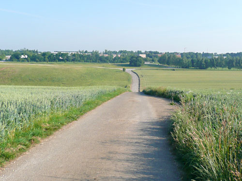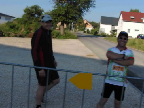 Die Kehre bei etwa 61 km und der anbrechende Tag veränderte die Situation schlagartig. Die steile ´Napoleonrampe´, ein heftiger Straßenanstieg, gefolgt von einem Fußweg mit mehreren Kehren ließ den Höhenmesser um gut 100m ansteigen. Auch der durchtrainierte Uli hatte hier mit seinem Rad seine liebe Not. Schadenfreude kam dennoch nicht auf. Oben wartete nach dem Klosterfriedhof neben der Elchinger Barockkirche der fünfte Wechselpunkt der Achterstaffel. Erst ansteigend zunächst auf einer Straße und dann auf Kieswegen folgte der Kurs dem Ziel entgegen. Eine kleine Schleife mit Blick auf das erwachende Ulm führte im weiteren Verlauf abwärts durch Thalfingen. Nach einer Straßenquerung im Tal der nächste VP. Die Jungs von der örtlichen Feuerwehr nutzten hier ihren Einsatz wohl zu einer dienstlichen Grillparty.