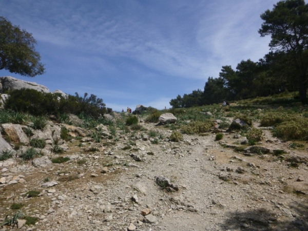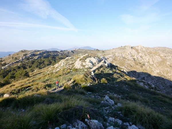 Entlang einer Wasserleitung zog sich der Weg kilometerlang fast eben, bis ich endlich am Fuß des Coll de Pra de Massanella, mit etwas über 1200 Metern dem höchsten Übergang des Ultratrails, ankam. In engen, staubigen Serpentinen zog sich der Weg bis hinauf zur Passhöhe. Und die Mittagssonne brannte gnadenlos auf mich herab, kein Baum sorgte für schützenden Schatten. Zum Glück erfrischte immer mal wieder ein kühler Wind den anstrengenden Aufstieg. Schon von weitem konnte ich sehen, wie einige Läufer vor mir die Passhöhe erreichten und dann verschwanden. Jetzt konnte es nicht mehr weit sein, bis ich auch oben war und meinen vorletzten Abstieg in Angriff nehmen konnte. Meine Beine freuten sich auf eine Abwechslung. Doch ganz so unbeschwert und flüssig ging es nun nicht mehr voran, die vielen anstrengenden Kilometer waren jetzt doch deutlich zu spüren. Nur noch fünf Kilometer trennten mich von der nächsten Verpflegung im Kloster Lluc, aber diese Strecke wollte kein Ende mehr nehmen! Dann säumten wieder Zuschauer den Weg und schon kam ich auf eine Asphaltstraße, die mich direkt ins Kloster Lluc (VP km 94,8) führte – zum Beten, nein mehr zum Essen und Trinken! Wieder drängten sich viele Zuschauer in und um diesen Ort, der bedeutendste Wallfahrtsort der Insel. Es war bereits kurz nach 17 Uhr und die Sonne zeigte sich nun in einem ganz besonderen Licht.