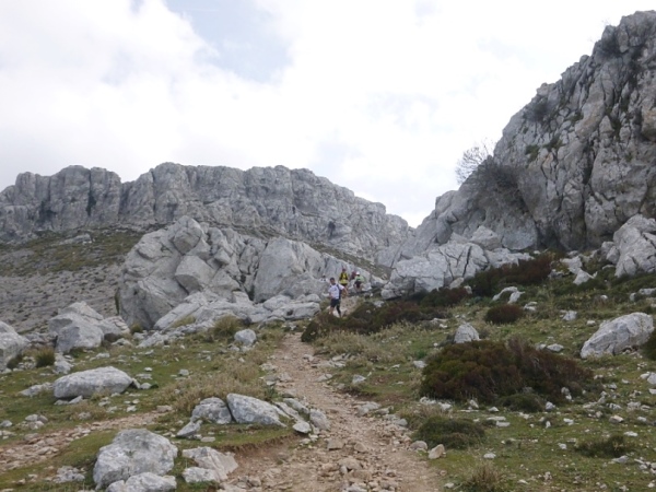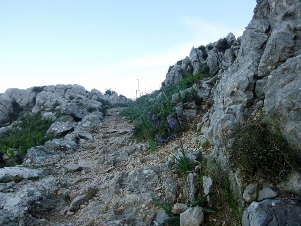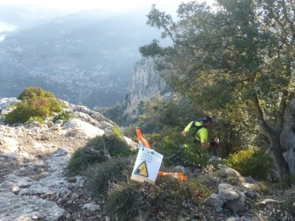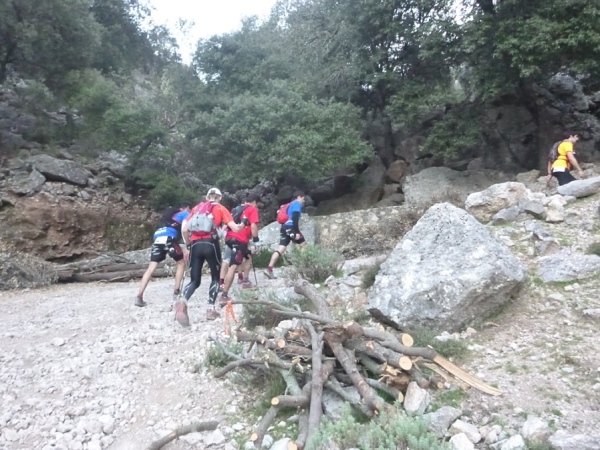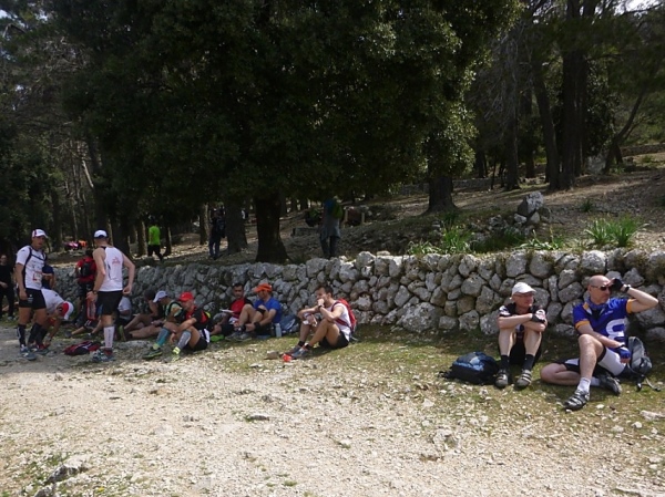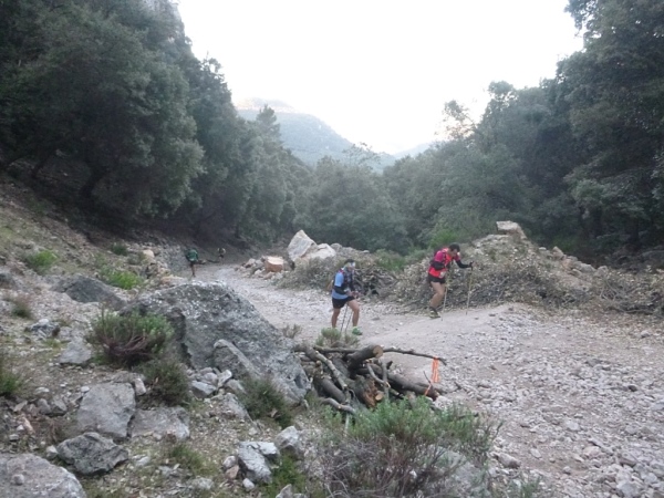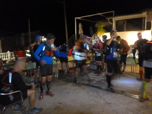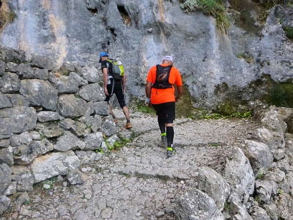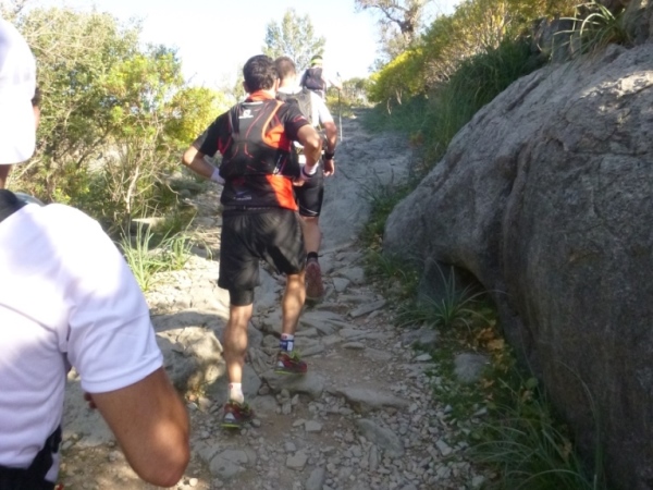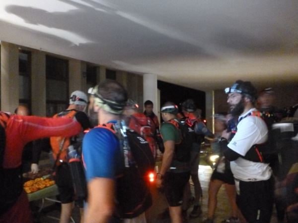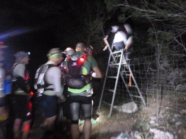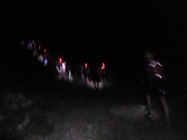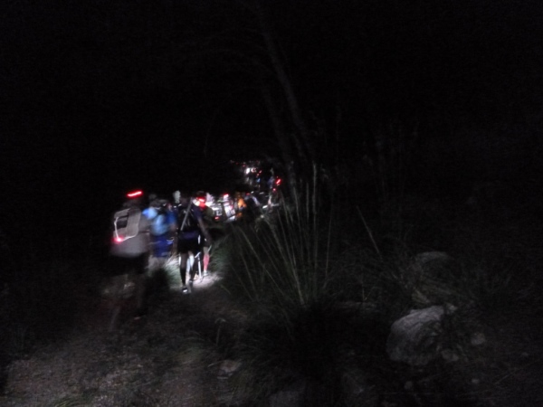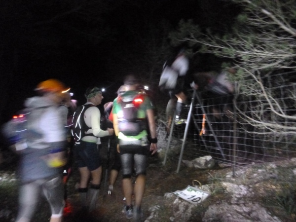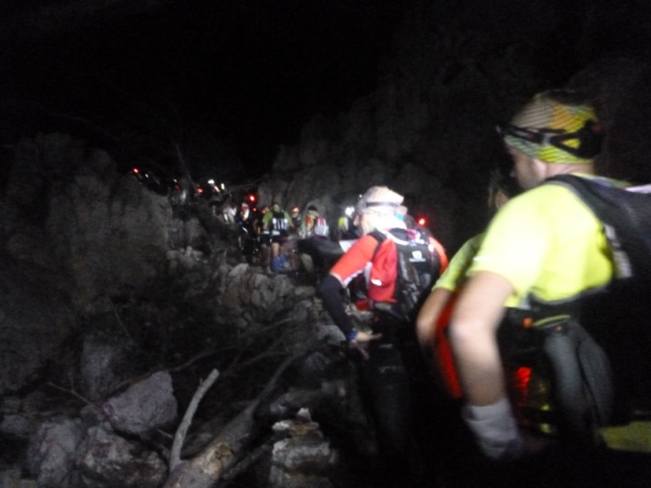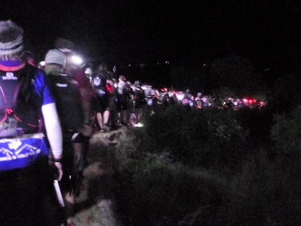 Kaum hatten wir jedoch dieses Hindernis gemeistert, kam auch schon die nächste Herausforderung. Zuerst waren die Wege noch recht breit, doch dann behinderten schmale, steile Gebirgswege mit vielen Felsstufen und abschüssigen Querungen das Vorankommen der Ultraläufer. Wir konnten uns stellenweise nur sehr langsam fortbewegen und mussten auch längere Wartezeiten in Anspruch nehmen, je weiter hinten umso länger wurde das Warten. An einer steilen Felswand musste ich zuerst einmal einen festen Tritt suchen und einen Griff zum Hochziehen, bevor ich die Passage an meinen Hintermann frei machen konnte. Immer noch bergauf ging es auf schmalen Pfaden einfach weiter. Leider konnten wir in der dunklen Nacht nur den von der Stirnlampe erleuchteten Bereich erfassen und sahen neben Felsen, Geröll und Steinen noch die Büsche und Gräser am Wegrand.