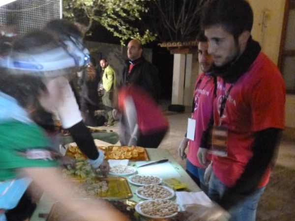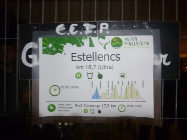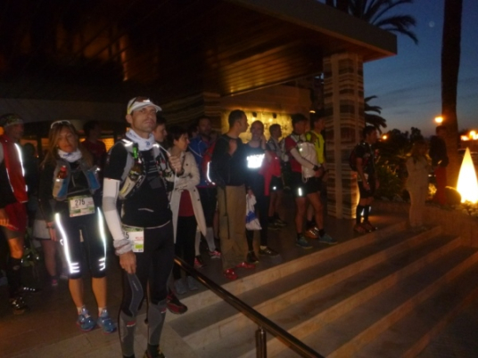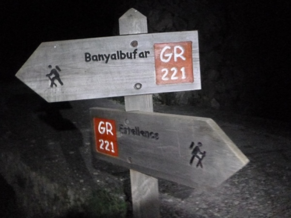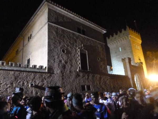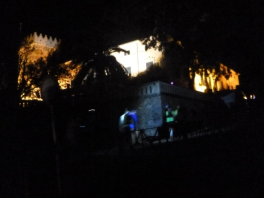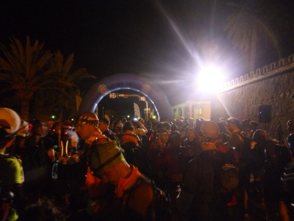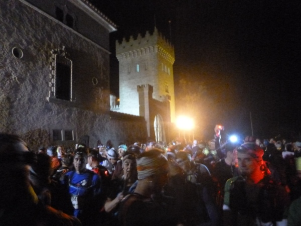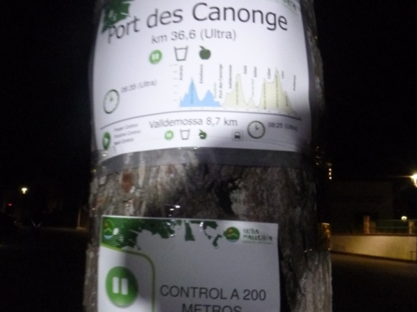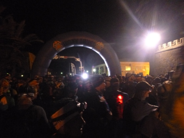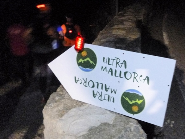 Im Getümmel der Sporthalle packte ich dann die überflüssigen Kleidungsstücke fürs Ziel in einen Plastiksack, der mit meiner Startnummer versehen war und gab diesen bei der Gepäckaufgabe ab. Plötzlich war Aufbruchstimmung und alle strömten zum Ausgang und durch die Straßen von Andratx bis hinauf zum Castillo de Andratx, wo sich schon viele Ultraläufer eingefunden hatten und aufgeregt auf das Startzeichen warteten. Pünktlich gings dann auch auf die Strecke, ich mittendrin in der Läufermenge. Vor mir sah ich die roten Lichter, die auf dem Rücken der Ultraläufer leuchteten. Nach vorne blendeten die hellen Stirnlampen und leuchteten den Weg aus. Kaum hatten wir die Häuser von Andratx hinter uns, folgten wir einem breiten Wirtschaftwegen stetig bergan, bis sich plötzlich die roten Lichter vor mir umdrehten und zurückkamen. Was war denn jetzt los? Laute, aufgeregte Stimmen und alle liefen zurück. Zum Glück war ich nicht zu weit vorne. Aber trotzdem kamen ja noch von unten viele Läufer den Berg hoch. Es wurde extrem eng, aber die Stimmung blieb gelassen. Es wurde diskutiert, wo und wie der Weg nun am besten zu finden wäre. Und obwohl die Zeit weiterlief, wurde nichts überstürzt!