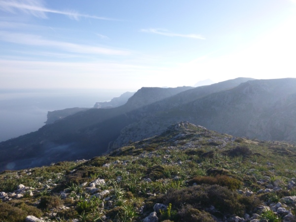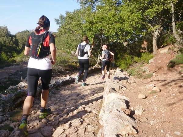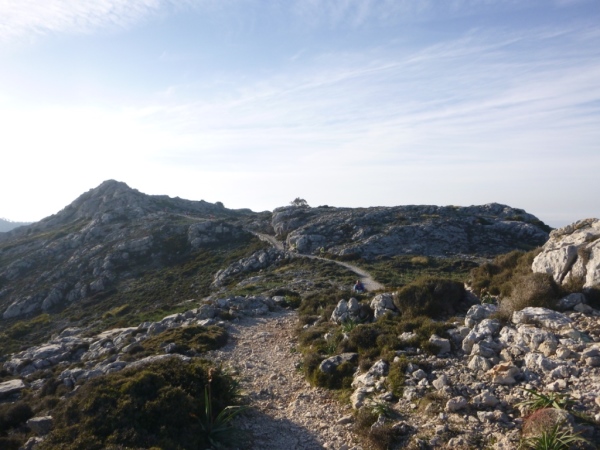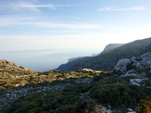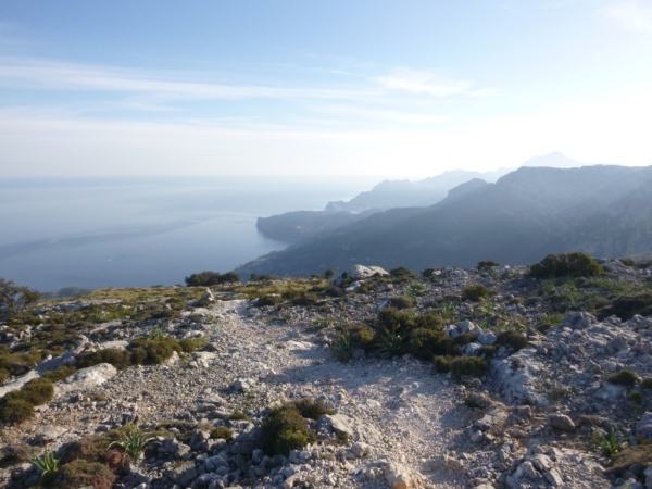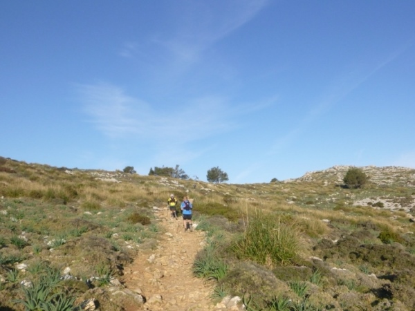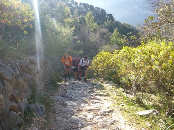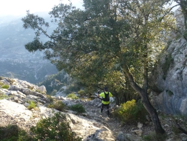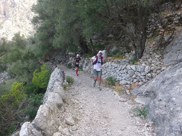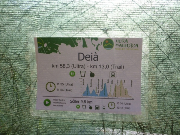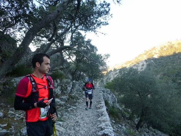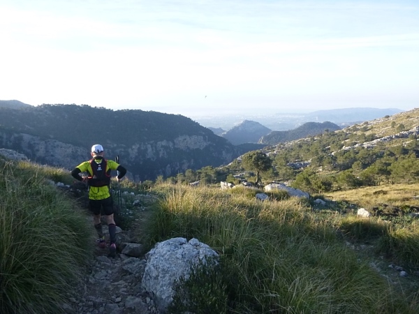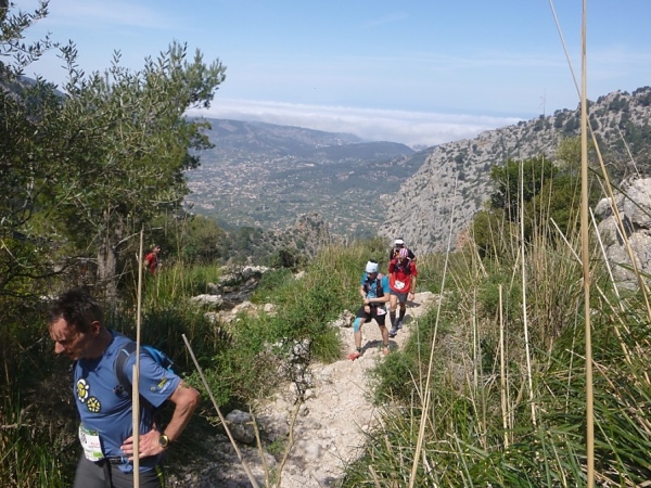 In der VP Valldemossa (km 45,3) war ich dann um kurz vor 7 Uhr und befand mich schon wieder am Aufstieg, bevor der Trail um 8 Uhr gestartet wurde. Bald würden die „schnellen“ Trailläufer an mir vorbeisprinten. Auch wenn ich auf den schmalen Bergwegen und steilen Pfaden öfters anhalten oder ausweichen musste, um den Weg frei zu machen, freute ich mich über die Begegnungen und bewunderte ihre ihre Leichtigkeit, mit der sie die anspruchsvollen Steinwege hinauf oder hinab rannten, als gäbe es keine Stolperfallen. Nach jeder anstrengenden Passagen wurde ich mit tollen Ausblicken auf die mallorquinische Bergwelt und die Steilküste belohnt. Allein dafür hatte sich alles gelohnt! Und außerdem: Ich war ja gekommen, um die einzigartige Bergwelt im Tramuntana zu genießen. Die VP Deià (km 58,3) erreichte ich kurz vor halb zehn. Am Straßenrand applaudierten schon viele Zuschauer den Ultra- und den Trailläufern für die bis dahin erbrachte Leistung. Immer wieder hörte ich das lobende Wort „ánimo“, was ich mit den Worten „Mut“ oder „Kopf hoch“ übersetzen würde. Das sind besondere Momente beim Traillaufen in den Bergen.