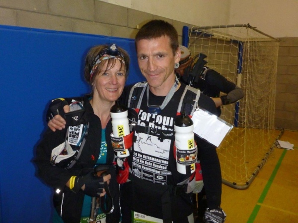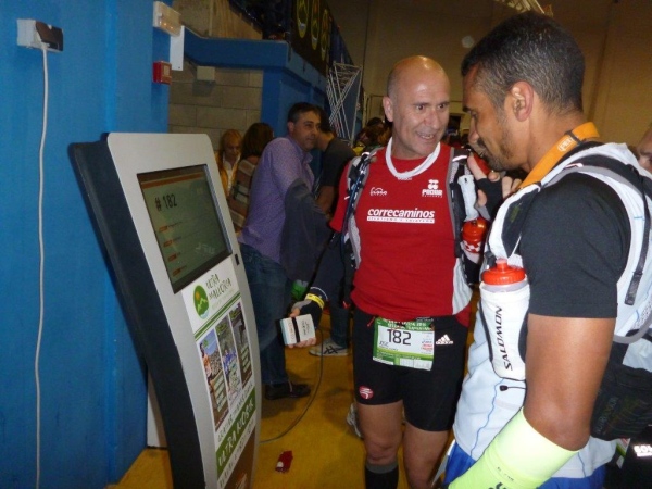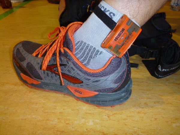 Personalausweis vorzeigen, Enthaftungserklärung unterschreiben und schon bin ich im Besitz der Startunterlagen, zu welchen ein Funktionshemd und drei (!) Chips auf Papierstreifen für die Zeitmessung gehören. Einer kommt ums Handgelenk, einer ist auf der Rückseite der Startnummer und einer klebt an einem Plastikkästchen, welches im Stil einer Fußfessel um den Knöchel geschnallt wird.
