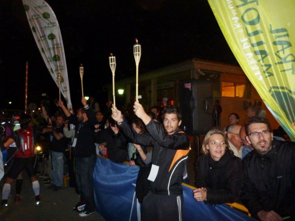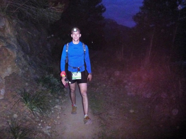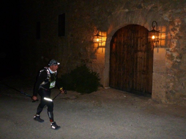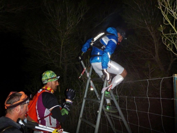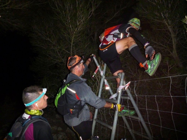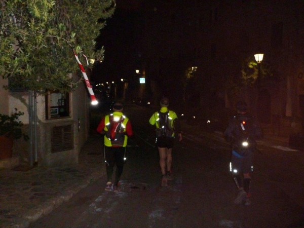 Im Dorf, kurz vor der Verpflegung, lässt sich ein Hahn zur Tageszeit verlauten. Ein Blick auf die Uhr zeigt mir, dass ich gut unterwegs bin und nochmals einige Minuten zum Zeitpuffer hinzufügen kann. Mit Jens und Julia laufe ich weiter in den bald anbrechenden Tag. Noch ist es aber dunkel und der Weg hält ein paar Überraschungen bereit. Unter der Schirmmütze bleibt der Ast über dem Weg meinem Blick verborgen, mit der Folge, dass mich ein heftiger Schlag stoppt und mir die Lampe vom Kopf hebelt. Ich klaube das Ding vom Boden und versuche es in Position zu bringen, mit der Wirkung, dass ich durch die Ablenkung zwei weitere Baumhindernisse nicht rechtzeitig bemerke und mir noch einmal den Kopf und den Ellbogen anstoße. Wenigstens sieht es belustigend aus, Jens meint, dass mein Torkeln schon fast die Slapstick-Qualität von Laurel und Hardy erreicht. Volle Konzentration ist kurz darauf angesagt, denn der Trail besteht für einige Meter aus zwanzig Zentimetern Rand einer Mauer. Auf einer Seite geht es runter, auf der anderen Seite ist ein Zaun, an welchem ich mich entlanghangle.