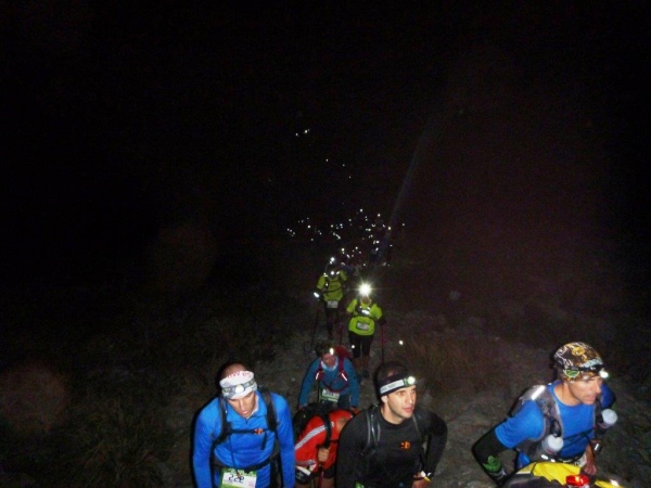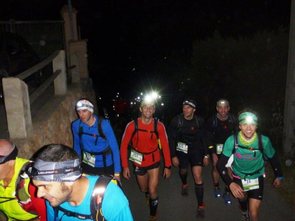 Diese erste ist mit 18,7km auch die längste Etappe des heutigen Tages und die mit den meisten Höhenmetern. Bevor es über teilweise wegloses, grasiges und felsiges Gelände zum „Holzschuh“ geht, wobei der Gipfel des s’Esclops nicht ganz bestiegen wird, gibt es einen Zwischenabstieg. Der Lichterwurm der Stirnlampen hinter mir und besonders vor mir ist eine eindrückliche Erscheinung. Mich fasziniert, wie weit sich die Spitze schon entfernt hat und durch das in Wanderführern nur gut geübten, trittsicheren Wanderern empfohlene Gelände prescht. Irgendwo dort oben geht der Reigen der Lampen nahtlos über in das Leuchten der Sterne.