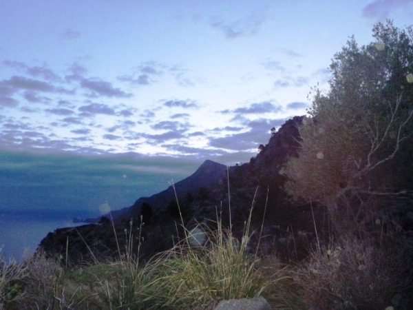 Ich schließe Bekanntschaft mit der mallorquinischen Vegetation und bin dankbar dafür, dass nur ein Streifen Haut über dem Knie ungeschützt ist. Die harten, scharfkantigen Gräser und zähen Zweige der Sträucher stellen sich den sie durchschreitenden Beinen unerbittlich in den Weg und die unregelmäßige Form der Steine und Felsen sorgen dafür, dass beim Auffangen des Stolperns auch viele Hände von Mitstreitern mit ihnen Bekanntschaft schließen. Stellenweise ist es für mich, glaube ich, vorteilhaft, dass wir nachts unterwegs sind und ich nicht sehe, wie es neben dem technischen Geläuf abfallend ist.
