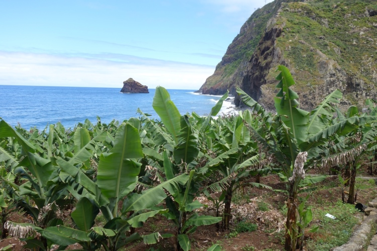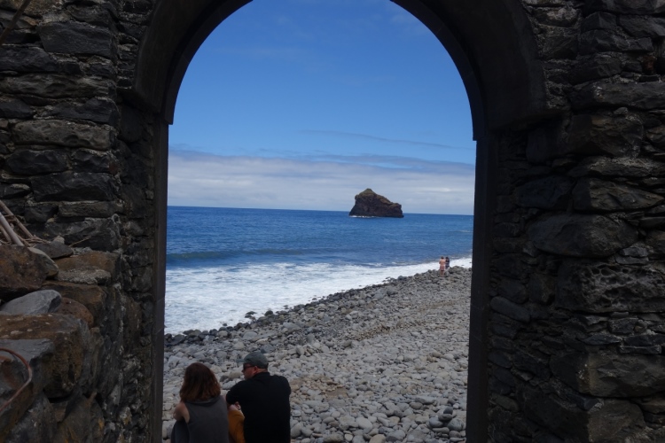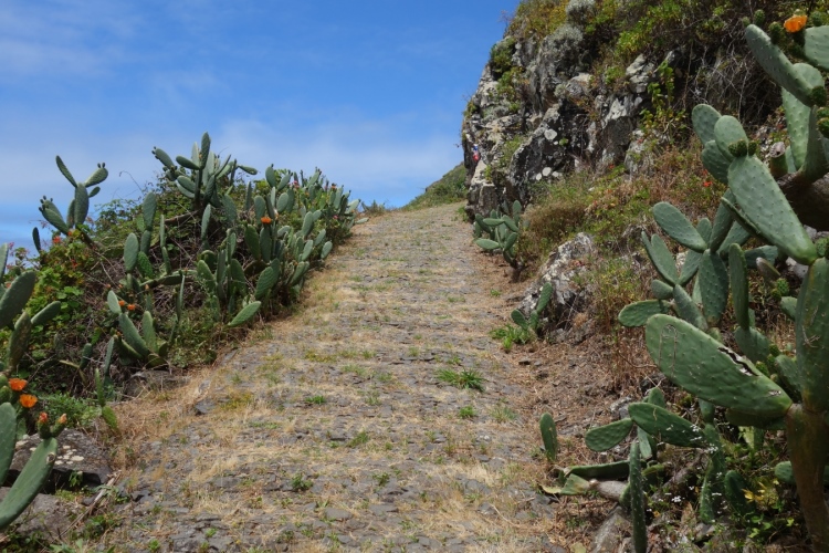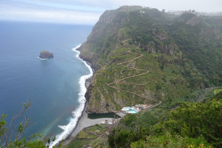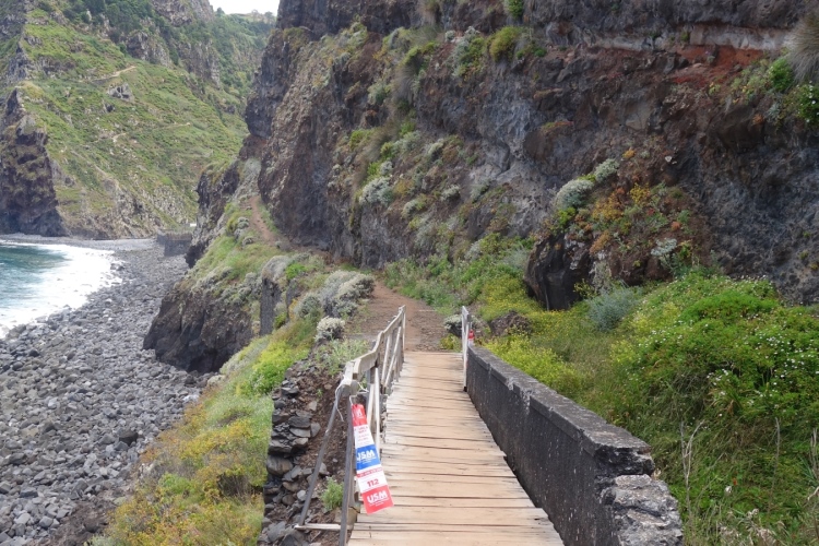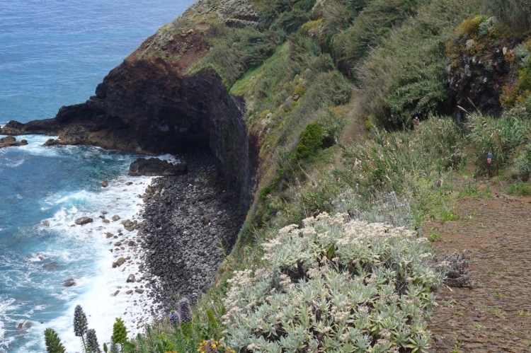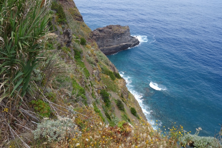 Von einer weiteren Straße geht es aber dann endgültig hinunter. Der Weg führt hinab zur Ponta de Sao Jorge. Bevor wir diese erreichen, biegen wir nach rechts ab zur Calhau de Sao Jorge. Der Weg entlang der schroffen Felsen der Nordküste ist beeindruckend. Genau wie die vorhin schon sichtbaren Serpentinen den Gegenhang hinauf. Ich ahne, da muss ich nach der VS hoch.