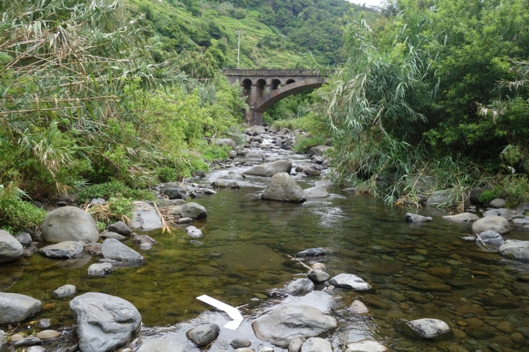 Der Bach der an der VS ins Meer fließt ist zu queren, denke ich. Aber nichts da. Die weiteren Markierungsfähnchen weisen den Weg durch das Bachbett den Bach aufwärts. Und das über mehrere hundert Meter. Ich fluche laut vor mich hin. Dass ich bis zur Hüfte im Wasser versinke und durch und durch nass werde, ist nicht so schlimm. Aber ich komme kaum voran. Die Bachpassage kostet mich wertvolle Zeit.