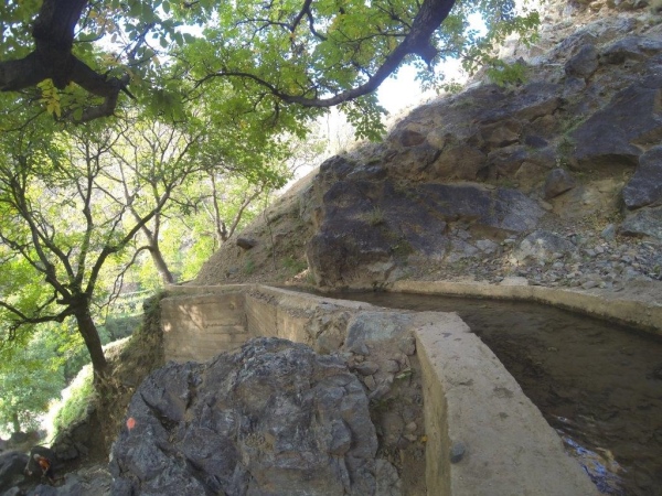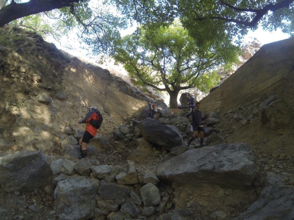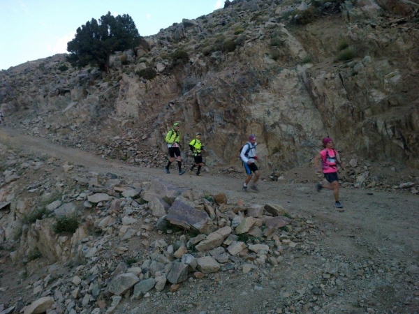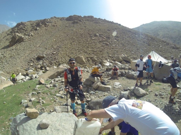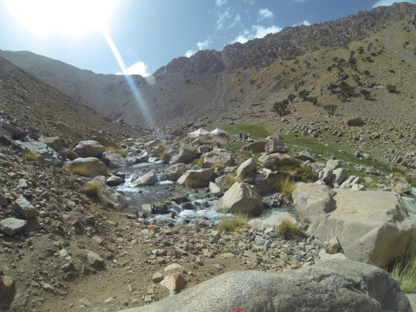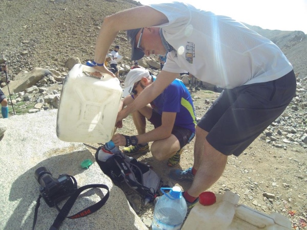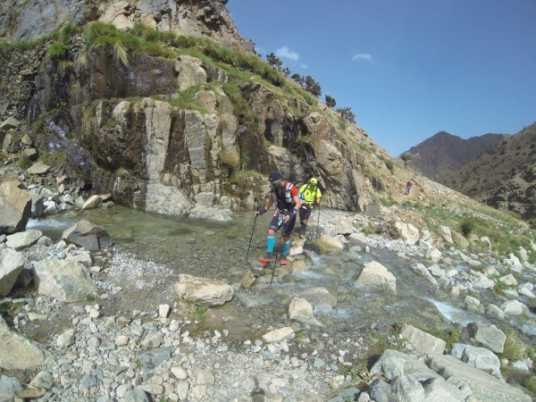 Der Weg wird zäh, die Luft dünner, die Sonne heißer. KM49,5 auf ca. 2300mtr mit gleichzeitiger Cut-off- Barriere wartet. Idyllisch, unglaublich beeindruckend, der tosende Bachlauf lädt zum Verweilen ein. Zu schön um wahr zu sein. Der Kontrollpunkt liegt autonom im Irgendwo und wurde einen Tag vorher mit einigen Maultieren, 5 Berbern und 3 Franzosen eingerichtet. Jean-Luc ist einer der über 60 freiwilligen Franzosen, welche alle zusammen über eine Woche für den Lauf Urlaub nehmen und ihre Freizeit für uns aufbringen. Genial und super freundlich. Halbzeit und der Spaß fängt nun erst richtig an. Die Augen schweifen weg vom Bach, 360° Rundumblick. Wo geht’s lang? Ohhh, da soll der Weg sein?