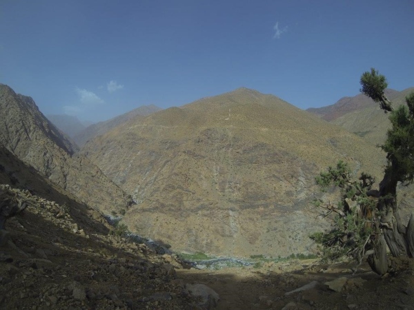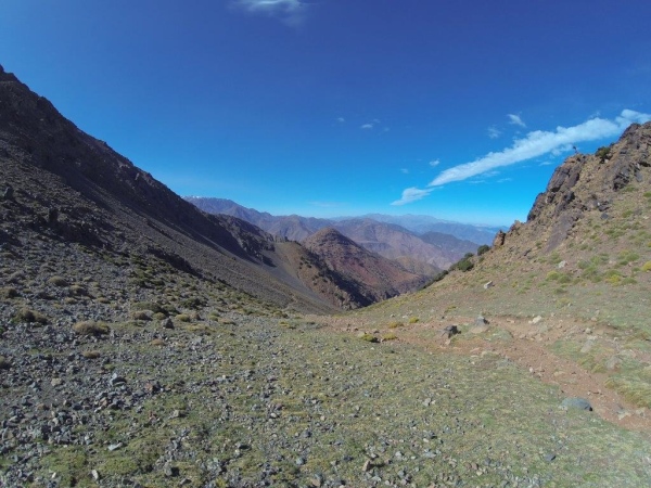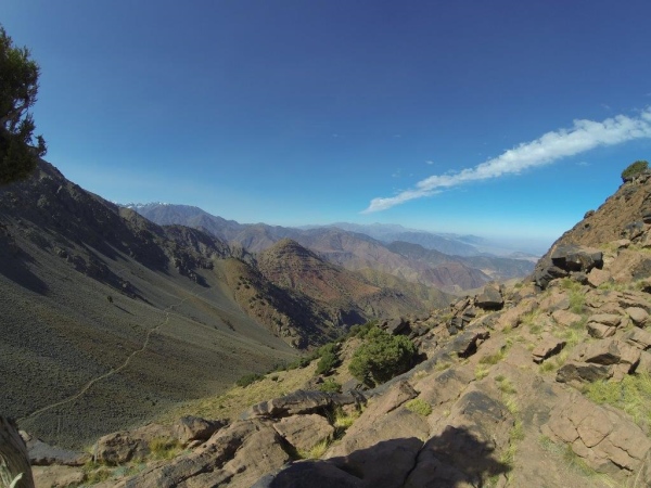 Mit dem Morgengebet um 6 Uhr verschwinden die jaulende Hunde, an Kindergeschrei erinnerndes Ziegen-Gemecker und der tobende Wind. Kurz vor Sonnenaufgang der erste unwirkliche Blick nach oben: Was für ein Sternenhimmel? Unglaublich intensiv. Toilettengang und Zähneputzen. Wieder der Blick gegen den Himmel: Was für ein Farbenspiel bei Sonnenaufgang. Unwirklich, bombastisch. Jetzt bin ich angekommen. Die Nacht ist vergessen. Ich bin in meinem Abenteuer gefangen. Die Blicke gehen 360° umher und entdecken immer mehr Sachen, welche meine Augen noch nie gesehen haben. Berberdörfer, jede Menge Gipfel über 3000mtr Höhe, unendliche Weiten.