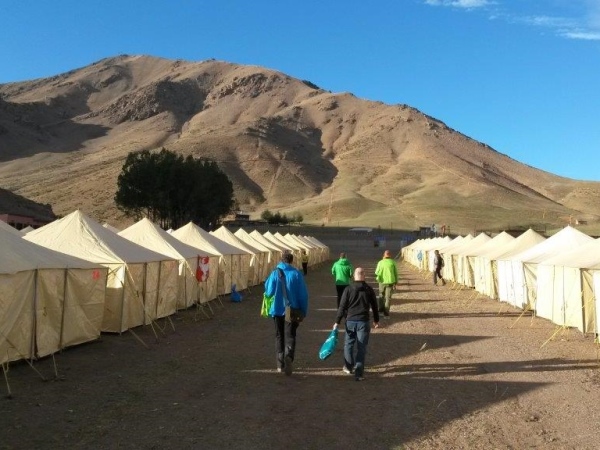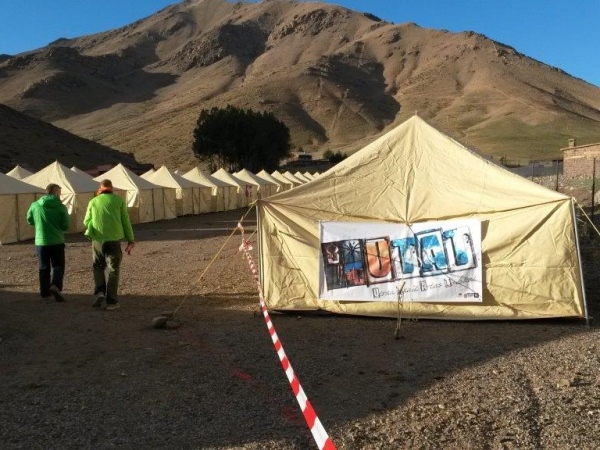 Ich treffe am Empfangszelt der Organisation ein. Bonjour and Hello, die Deutschen sind da. Ja, die Weltmeister sind da. Weltmeister sind wir, in allem. Aber hier in Marokko lernen wir das weltmeisterliche Entspannen, Improvisieren, oder einfach nur die französische Gelassenheit. Und was soll ich sagen: Es funktioniert auch. Vor vielen Wochen hatten wir den letzten möglichen Busshuttle um 18 Uhr reserviert, jetzt ist es 18:45 Uhr. Aber kein Problem sagt uns Morgane vom Empfang, nehmt euch Wasser, setzt euch, es kommt noch ein Bus, oder zwei... Wann? Achselzucken. Entschleunigung! Er kommt auch wirklich; je entspannter wir sind, desto mehr können wir das Ambiente genießen. Der Busshuttle nach Oukaimeden dauert ca. 90min und ist abenteuerlich schön.