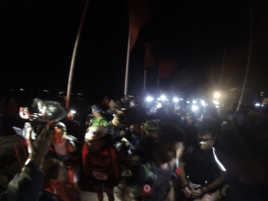 Der Start um 6 Uhr ist für alle 42+105km-Läufer gleich. 15min vor dem Start ist noch nicht viel zu spüren von Hektik, aber 5 min später boxt der Papst. Ludo und Seb heizen der Meute ein. Ein Gemisch aus Pop- und orientalischer Musik fetzt durch die Ohren, Blitzgewitter der Fotoapparate, Videoaufnahmen, Stirnlampen schwenken hin und her, ich wünsche meinem Laufpartner und dem daneben alles Gute auf der Reise, trois-deux-une - los.