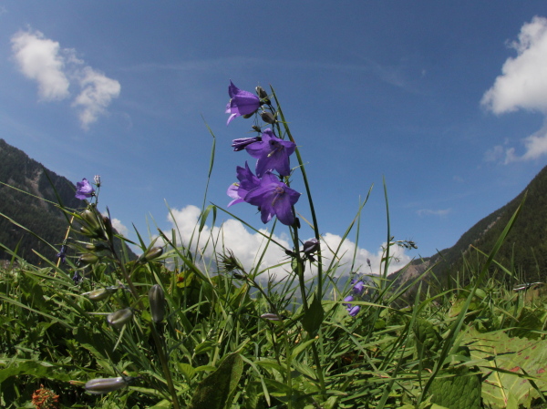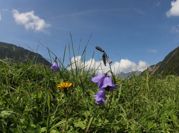Wir sind oberhalb des Val Ferret und schauen auf die Südhänge des Mont-Blanc mit Dent du Geant (Zahn des Riesen) und Grand des Jorasses. Das Laufen in dieser grandiosen Landschaft und auf dem jetzt fast ebenen und sehr guten Weg ist das reinste Vergnügen. Ich bin restlos begeistert und könnte ohne Ende fotografieren. Herrlich blühende Blumen säumen den Weg, der von etlichen mehr oder minder breiten und tiefen Bächen gekreuzt wird. Manche der Almhütten sind verfallen, andere sind bewohnt, wie der Rauch aus den Kaminen verrät.
