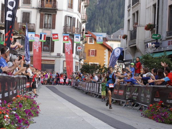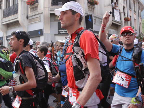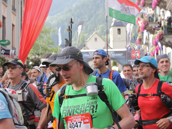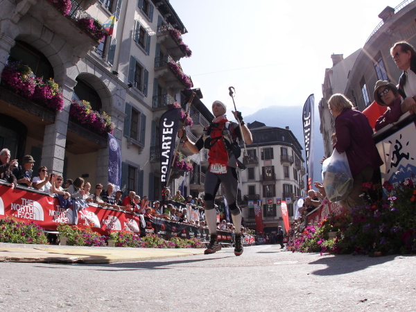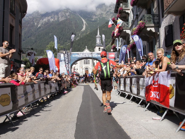 Auch das geht vorbei und kurz vor 9.00 Uhr kommt endgültig das Zentrum von Chamonix in Sichtweite. So steil vorhin noch einmal der Anstieg war, so steil geht es nun bergab. Und genau so tut es weh. Jetzt ist das egal. Gleich an der ersten Kreuzung geht es los. Applaus und anerkennende Zurufe. Die Leute bemühen sich, die Namen auf der Startnummer zu entziffern. Meiner ist kurz, das ist von Vorteil.