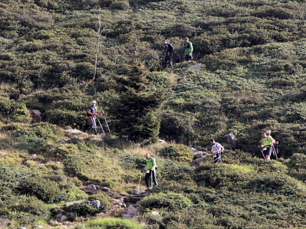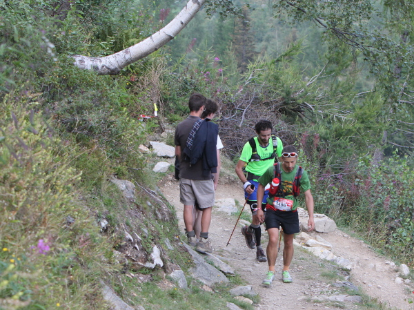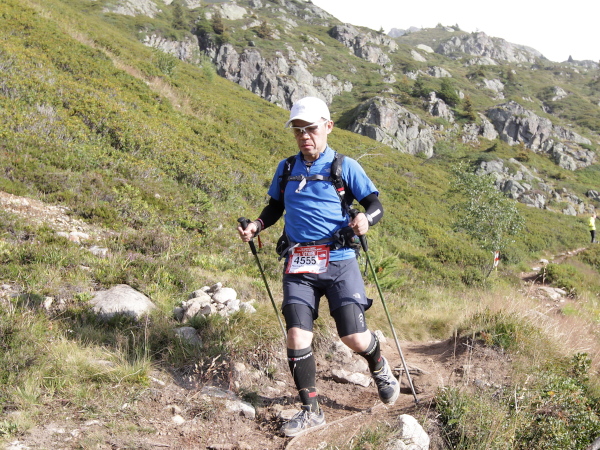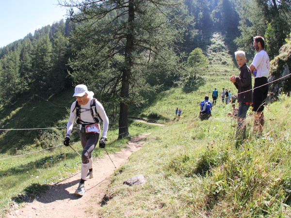 Auch als wir nach 75 Minuten das Ref. Bertone (km 5, 1989 m) erreichen, herrscht arges Gedränge an der Verpflegungsstelle. Eberhard wartet hier auf mich und hat einen ganz dicken Hals. Es wird mir klar, dass es so nicht weiter geht. Ich kann die für diesen Kraftakt notwendige Energie nicht aufbringen, wenn ich mich dauernd aufrege. Ärgere ich mich nur, weil meine Stöcke im Auto liegen? Ich weiß deren Vorzüge durchaus zu schätzen und bekomme es auch hier eindrucksvoll demonstriert. Mein Entschluss lautet: das nächste Mal mit Stöcken. Damit sind die Unannehmlichkeiten zwar nicht aufgehoben, aber ich stochere dann selber in der Luft und im Boden rum und brauche mich nicht mehr darüber aufzuregen.