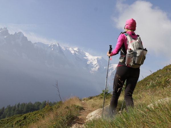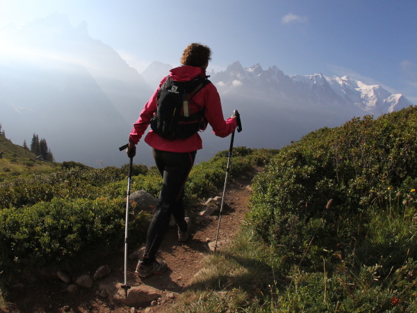 Die nächsten fünf Kilometer sind vergleichsweise bequem, es geht meist abwärts, und die Wege sind einigermaßen gut beschaffen. Als wir uns schon auf Chamonix freuen und damit rechnen, dass es nicht mehr lange dauert, verlassen wir unseren Weg nach rechts und es geht steil bergauf. Himmel, wer macht so was? Es ist nicht weit, aber es tut verdammt weh. Es ist ein herrlicher Aussichtsweg, mit Blick auf die Vororte von Chamonix. Aber wem ist jetzt danach?