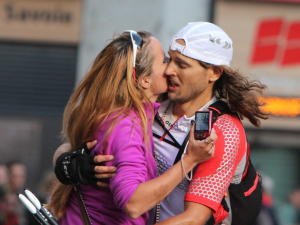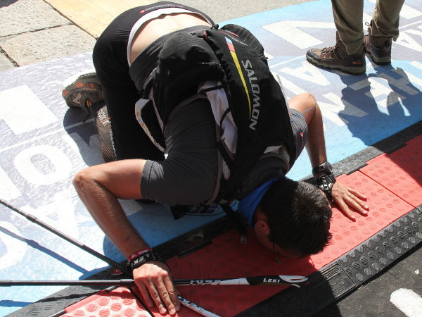 Dann ist es 16.00 Uhr. Der Sieger der ganz großen Schleife wird erwartet. Ohrenbetäubender Lärm und stürmischer Applaus brandet auf, als Marco Olmo, der 58jährige Italiener, auf die Zielgerade einbiegt (offizielle Zeit: 21:06 :06 Stunden). Lang gestreckt legt er sich auf die Straße, küsst den Boden und lässt sich feiern. Er verbessert seine Zeit gegenüber dem Vorjahr, wo er Dritter wurde, um fast 44 Minuten.