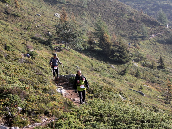 Als Bergwanderer packt man jetzt den Rucksack aus, macht eine Brotzeit, bestaunt die fantastischen Berge, studiert die Wanderkarte und legt sich ein Stündchen in die Sonne. Von alledem gibt es für uns nichts, die Verpflegung ist vier Kilometer weiter unten an der Alpages de la Peule (km 25, 2071 m). 30 Minuten brauchen wir, der schnellste Streckenabschnitt bisher.