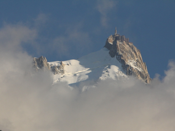 Endlich dämmert es, ich gehe zum Fenster und sehe vor dem Mont Blanc dichten Nebel, der bis in Tal reicht. Ich gehe auf den Balkon und sehe, wie die Felsentürme aus dem Nebel ragen und von der Sonne angestrahlt werden. Ich erinnere mich an Zermatt. Genauso präsentierte sich am Renntag morgens das Matterhorn und dazu meinte dann die Wirtin: „Es wird ein schöner Tag.“
